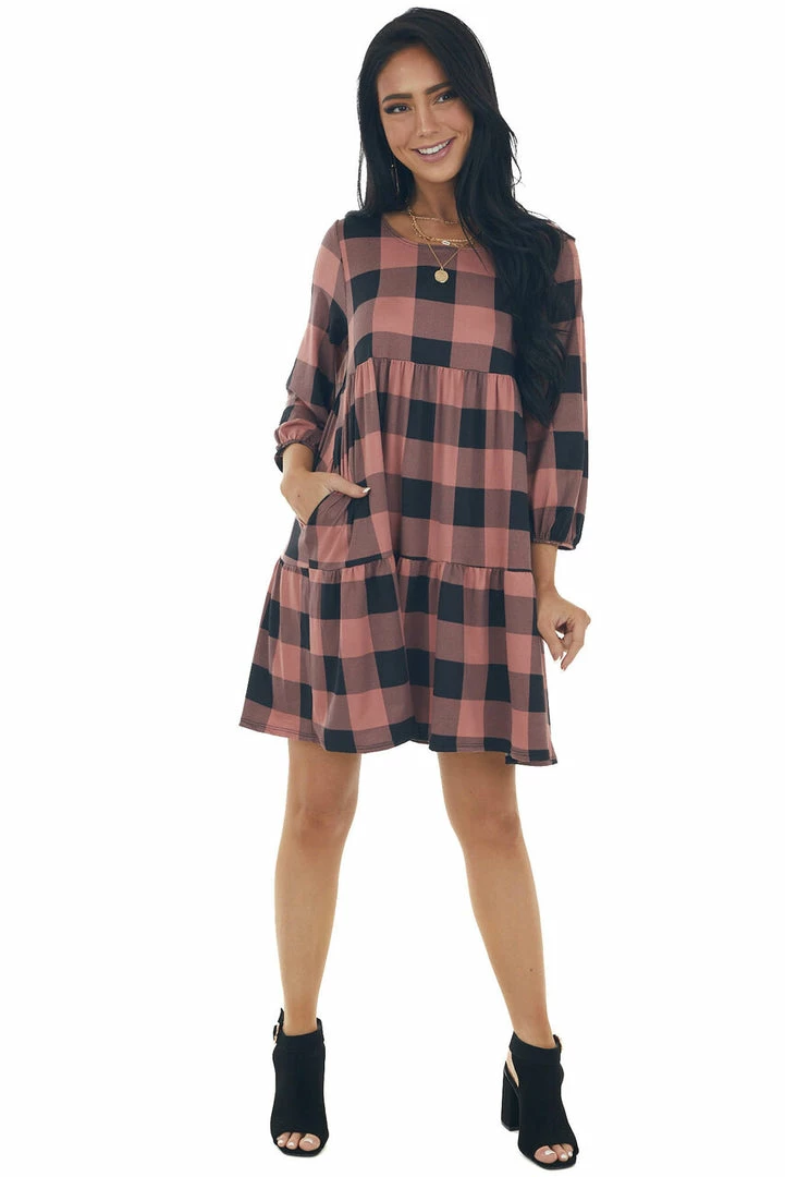 - Marsala Buffalo Plaid Long Bubble Sleeve Dress