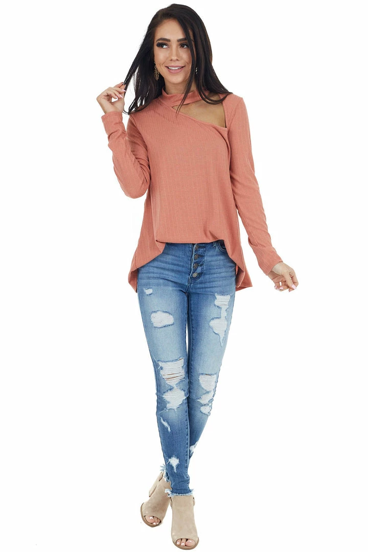 - Terracotta Long Sleeve Stretchy Knit Top with Cut Out Detail