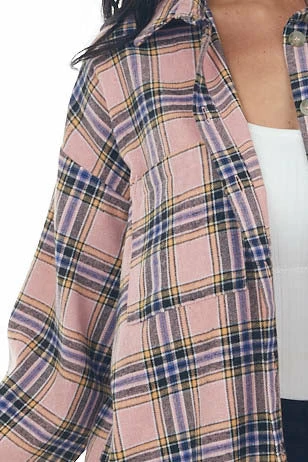 - Baby Pink Plaid Collared Chest Pocket Flannel