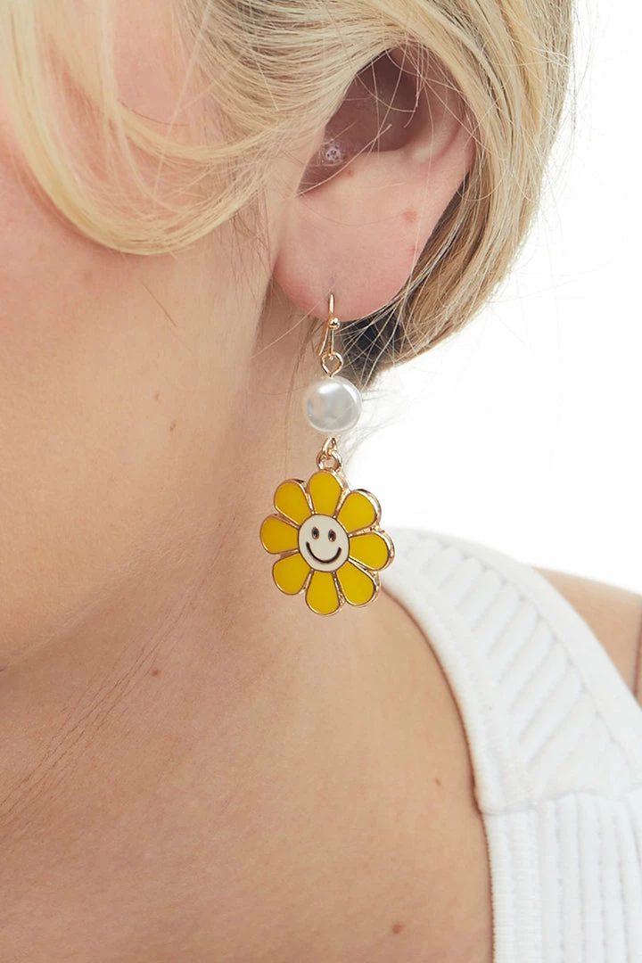 - Yellow Daisy Smiley Face Pearl Dangle Earrings