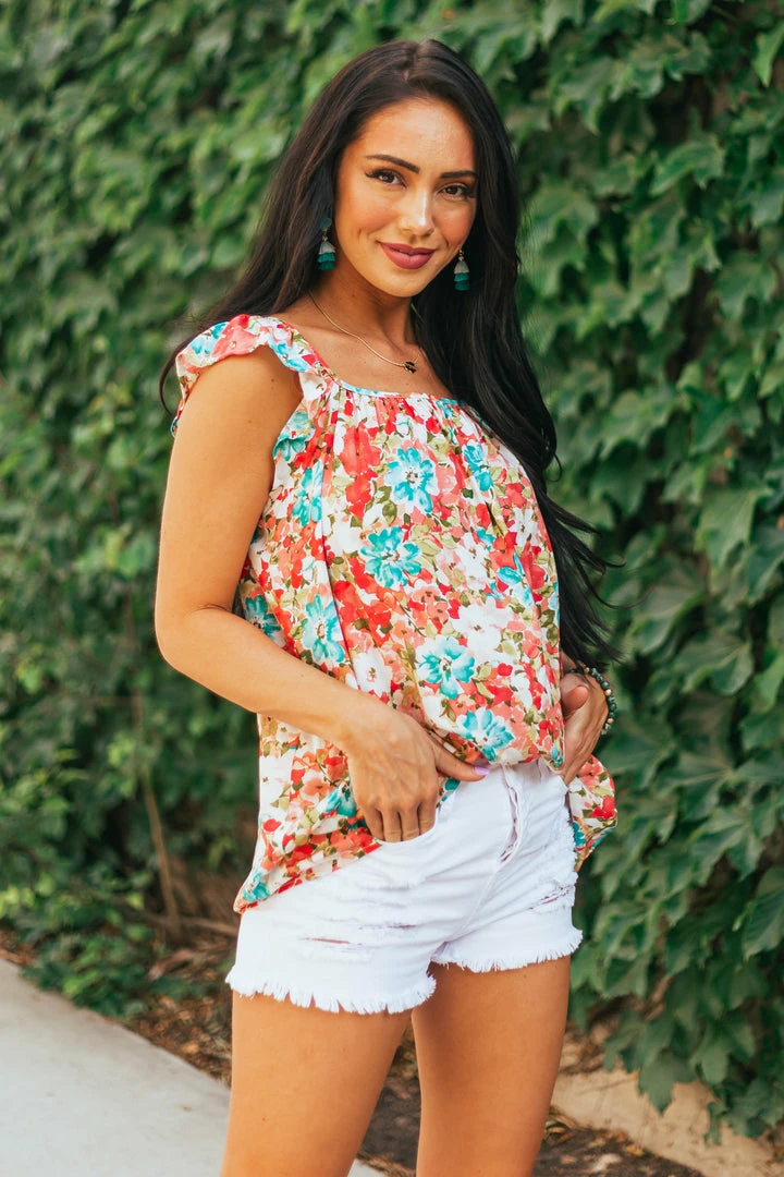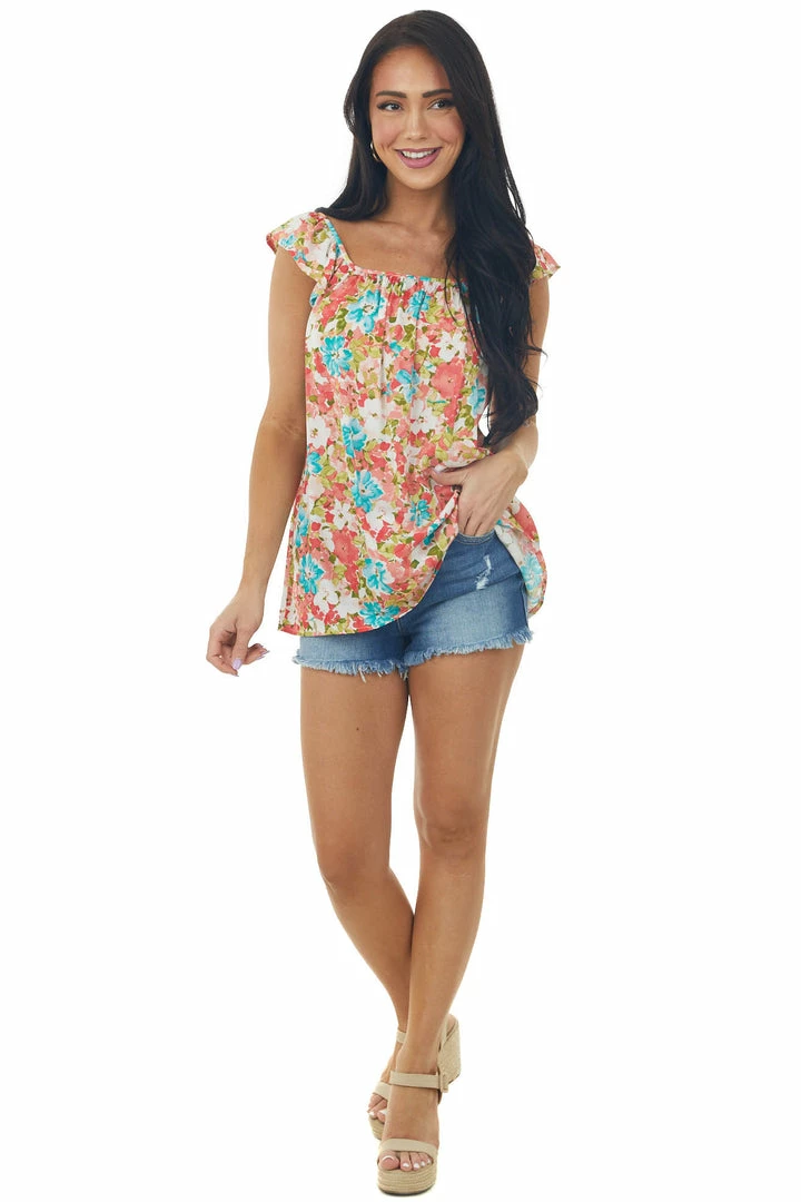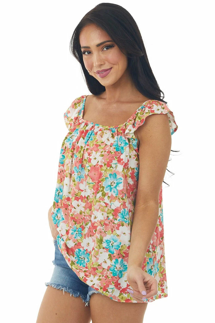 - Coral Floral Print Ruffle Short Sleeve Woven Top