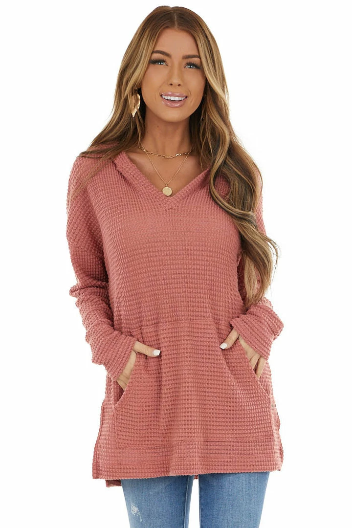 - Dusty Rose Stretchy Waffle Knit Hooded Long Sleeve Top