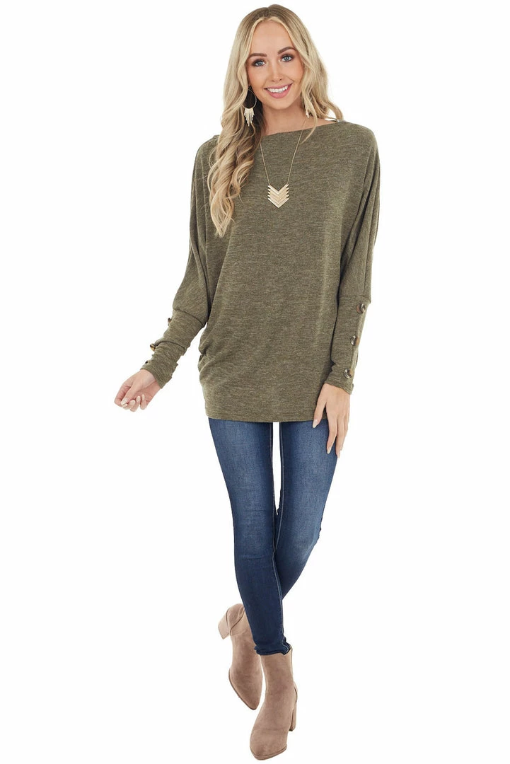 - Olive Dolman Sleeve Off Shoulder Top with Button Detail