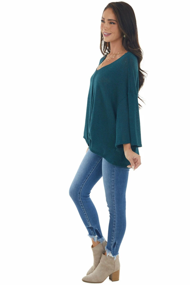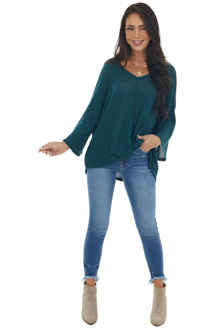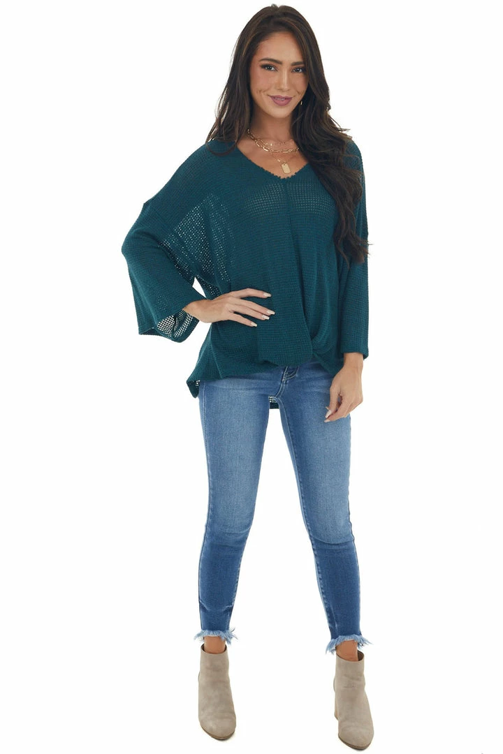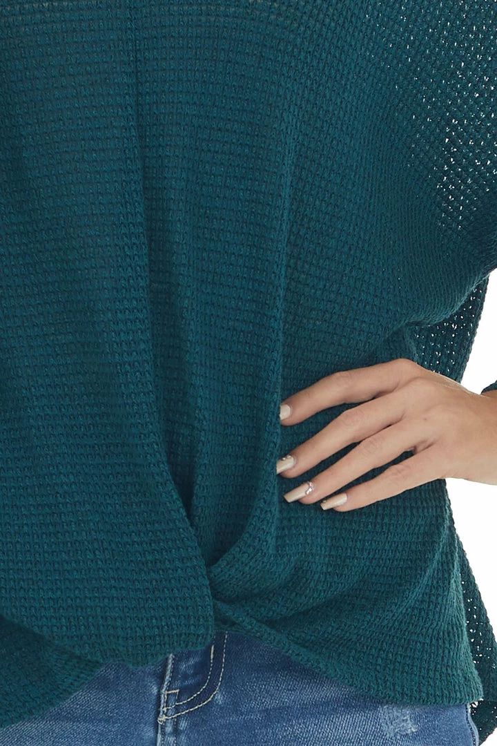 - Teal Flowy Sleeve Waffle Knit Front Knot Top