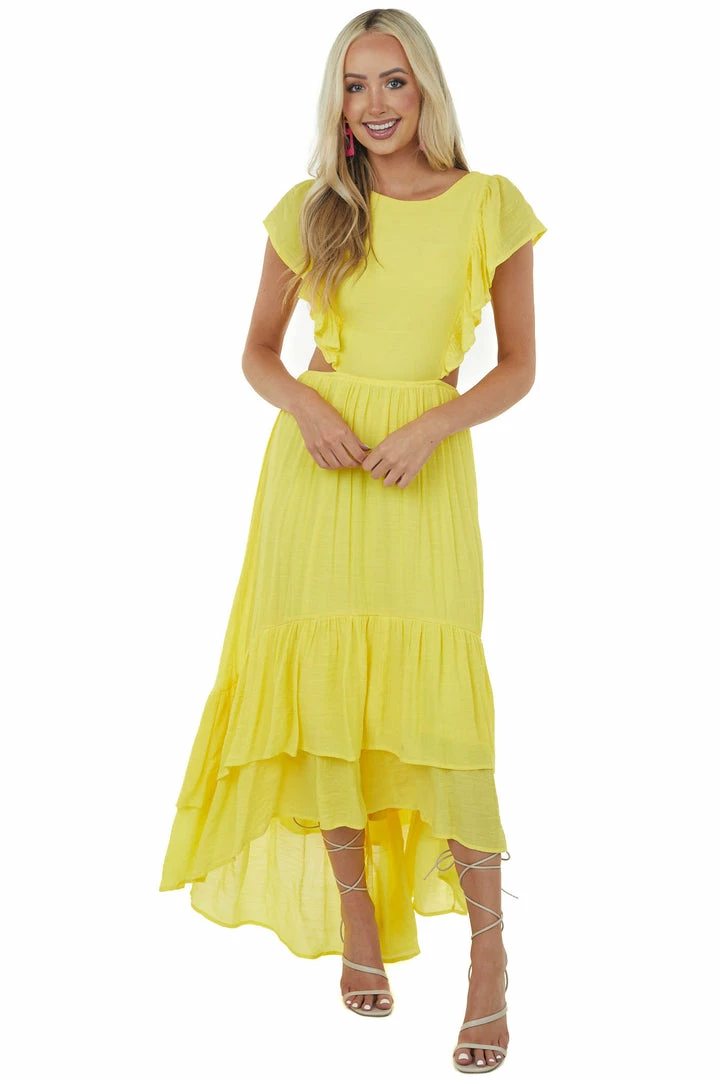 - Canary Yellow Side Cut Out High Low Woven Dress