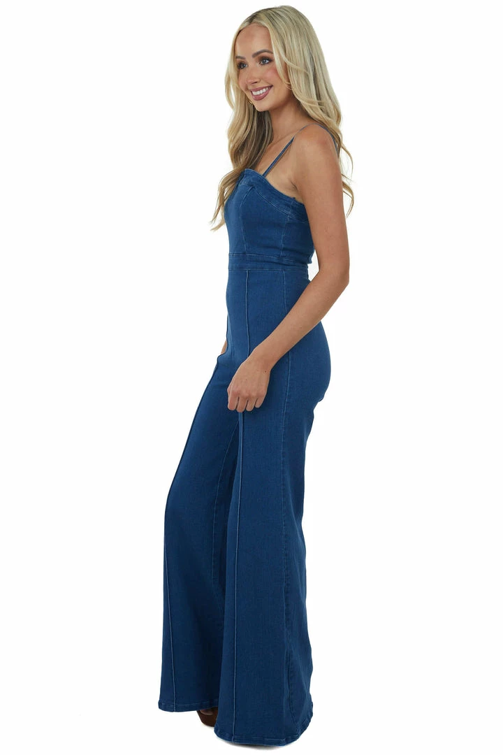 - Dark Wash Notch Neck Flare Leg Denim Jumpsuit