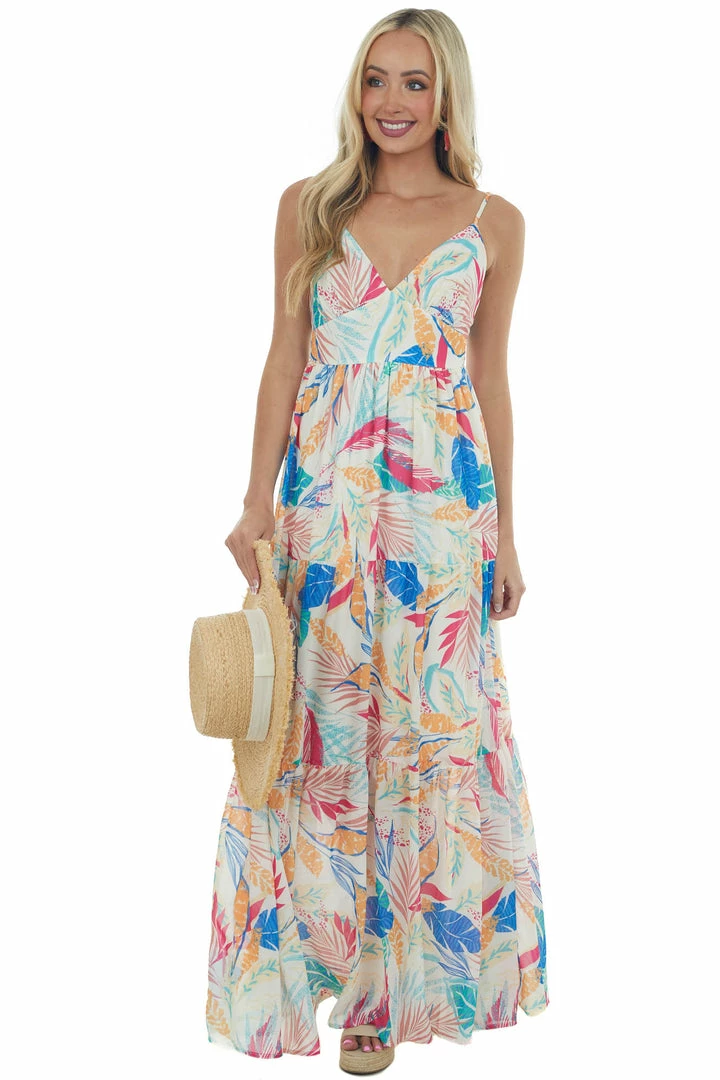 - Ivory Multicolored Leaf V Neck Tiered Maxi Dress