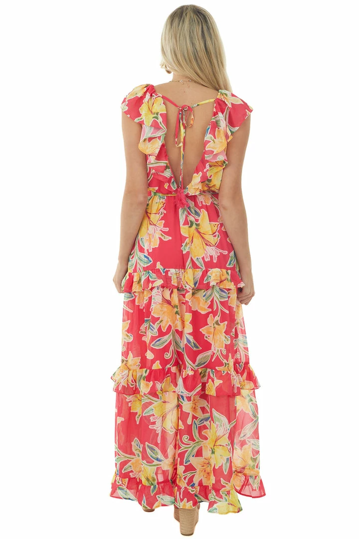 - Raspberry and Amber Floral Ruffle Maxi Dress