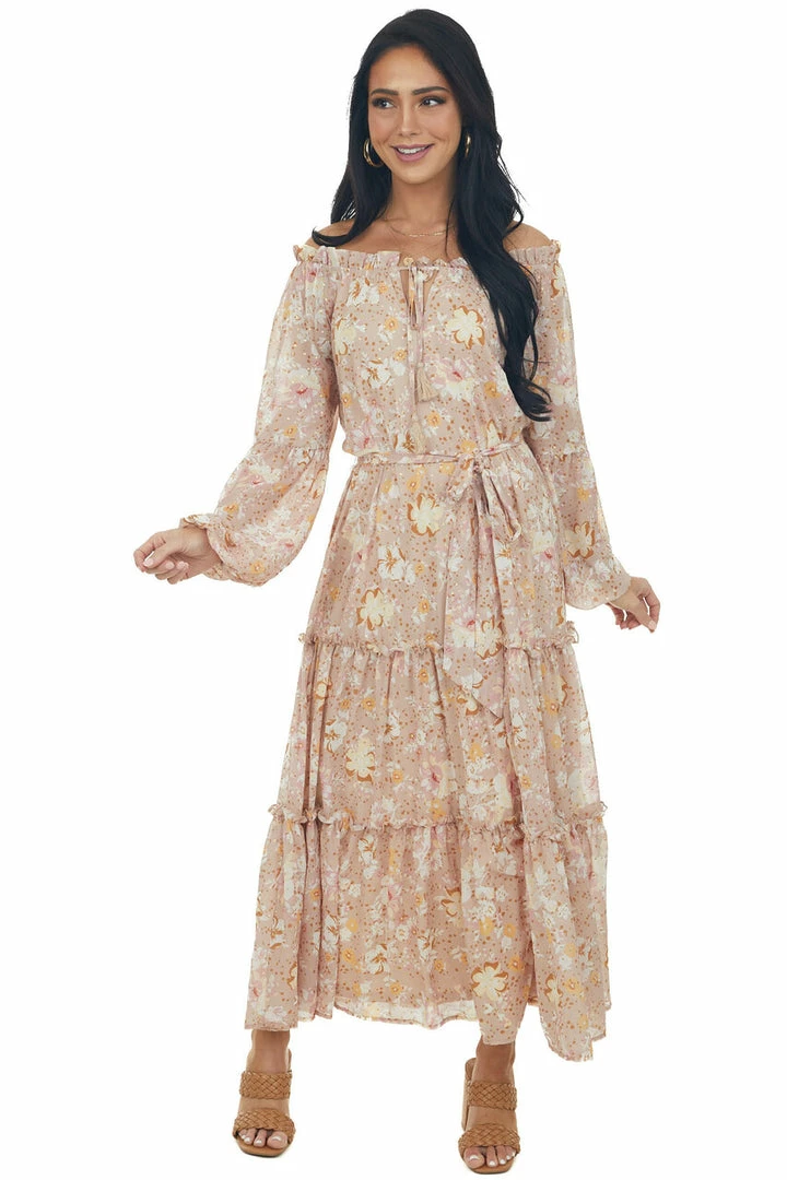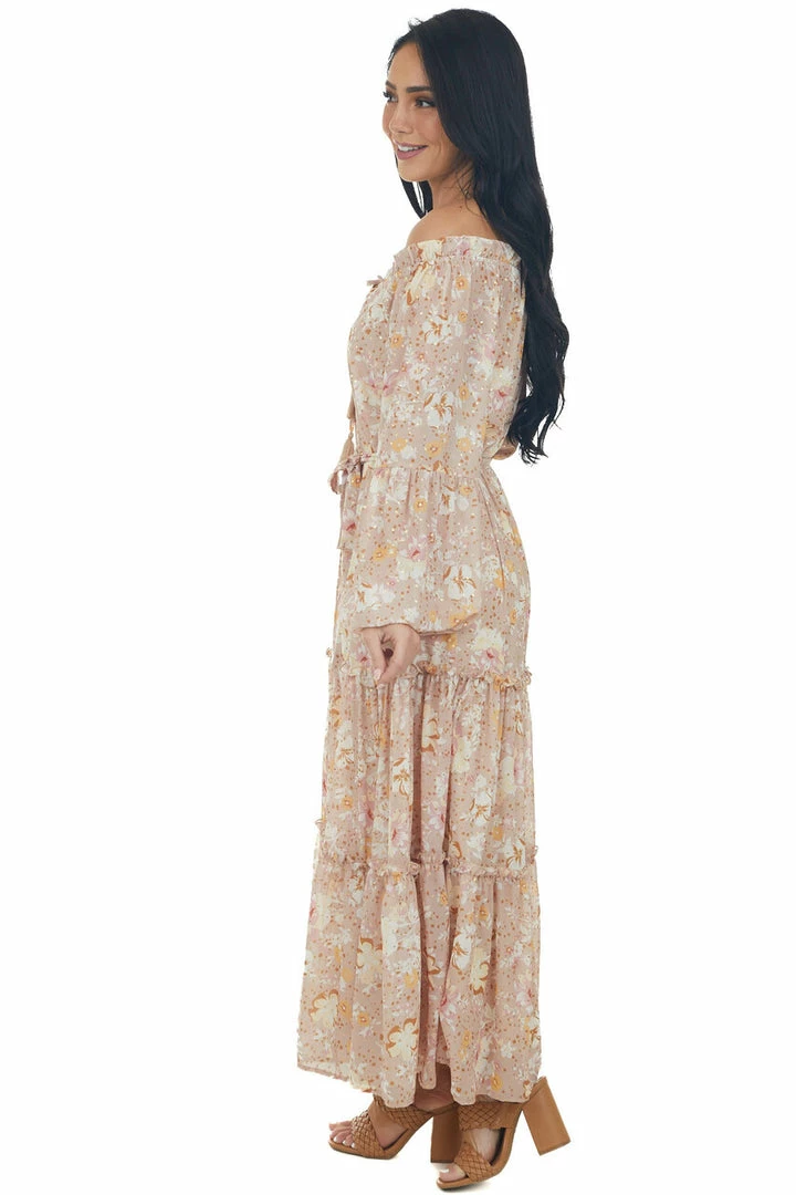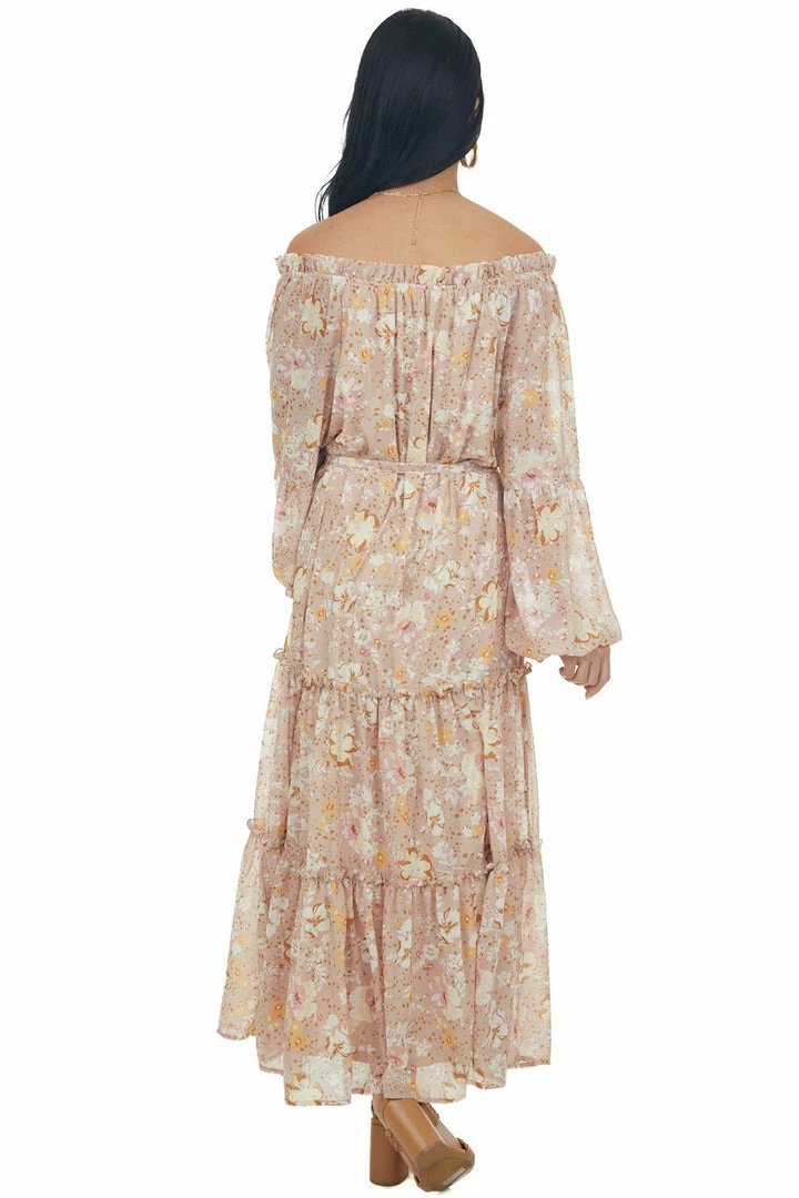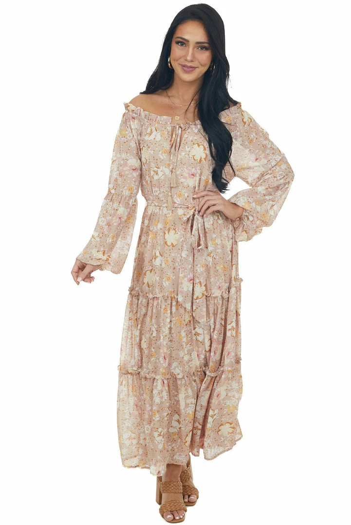- Nude Floral Print Gold Speck Tiered Maxi Dress