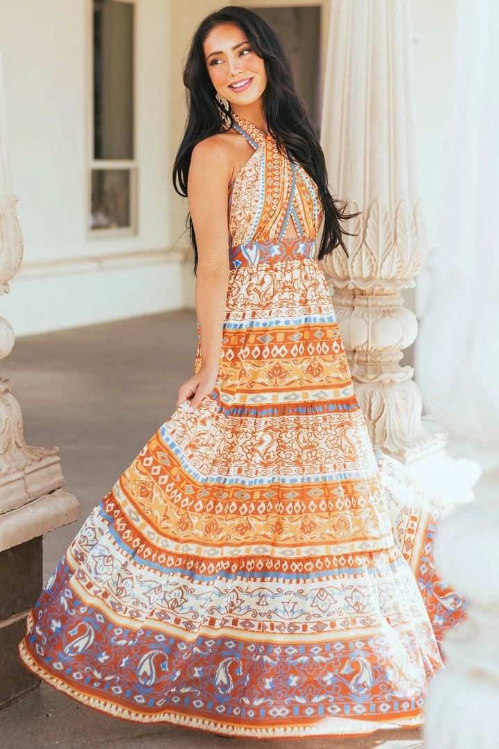 - Straw Boho Print Cross Halter Neck Maxi Dress