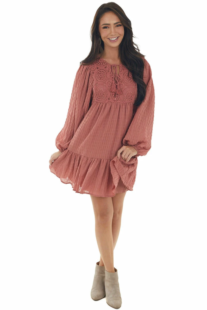- Vintage Rose Textured Puff Sleeve Lace Dress