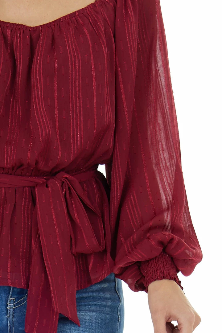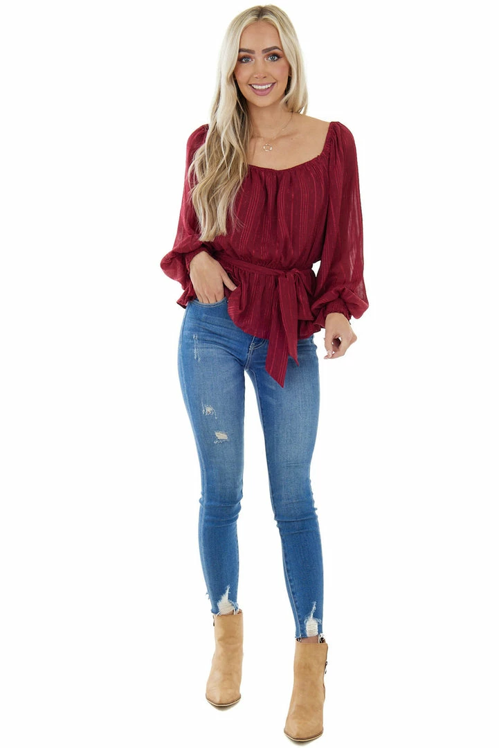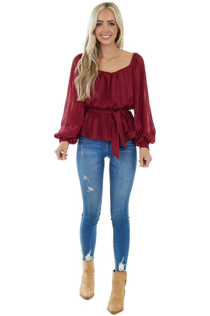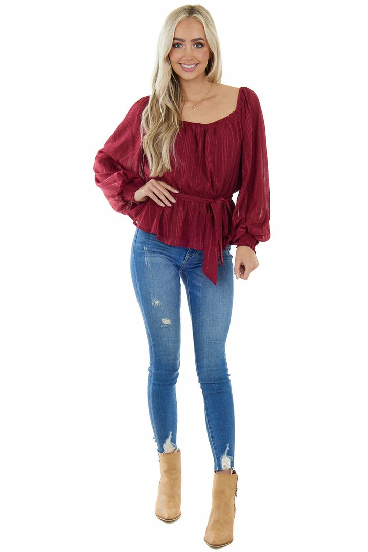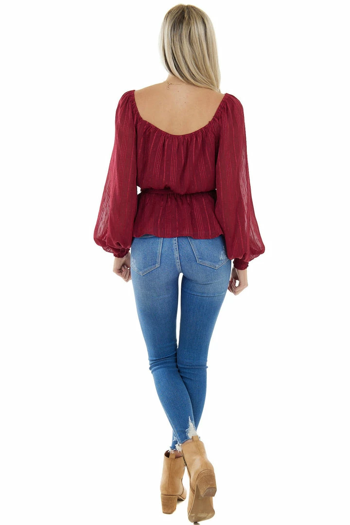 - Wine Stripe Textured Long Sleeve Peplum Blouse