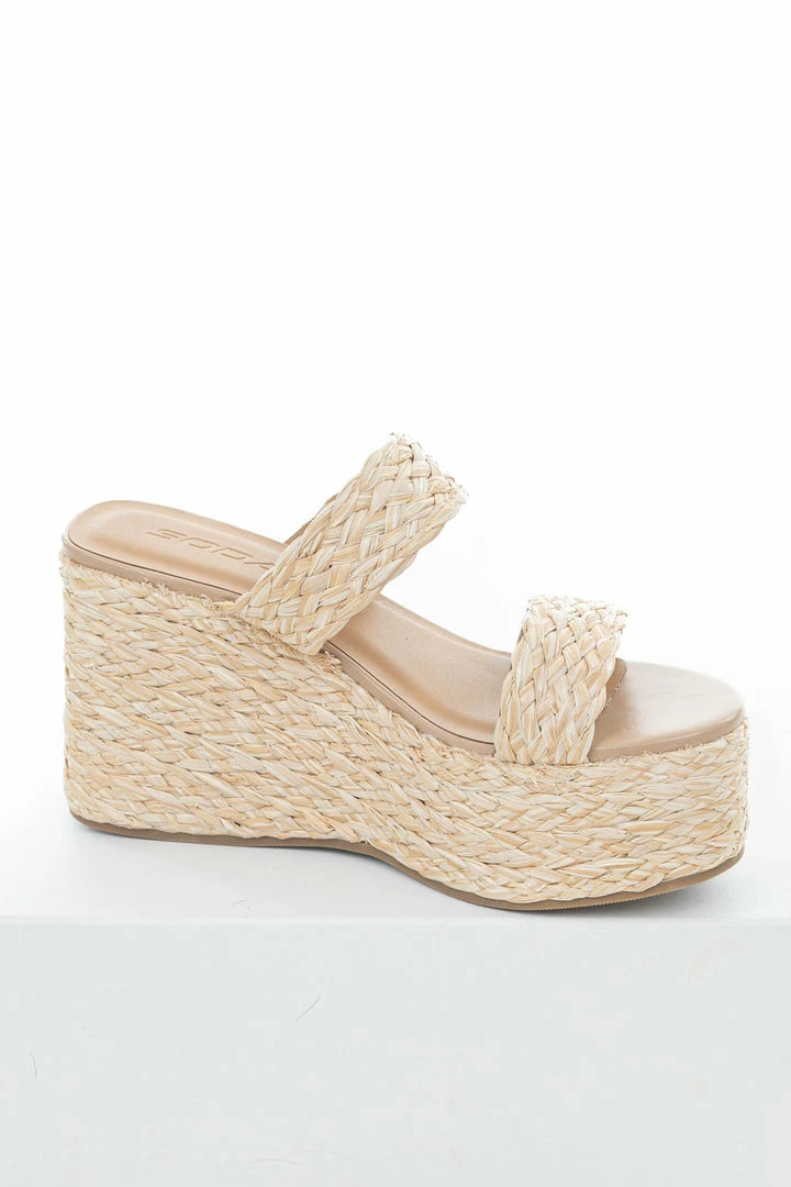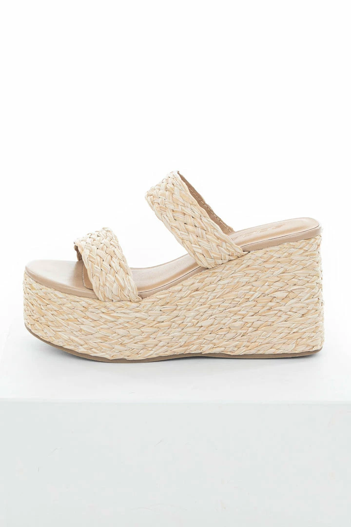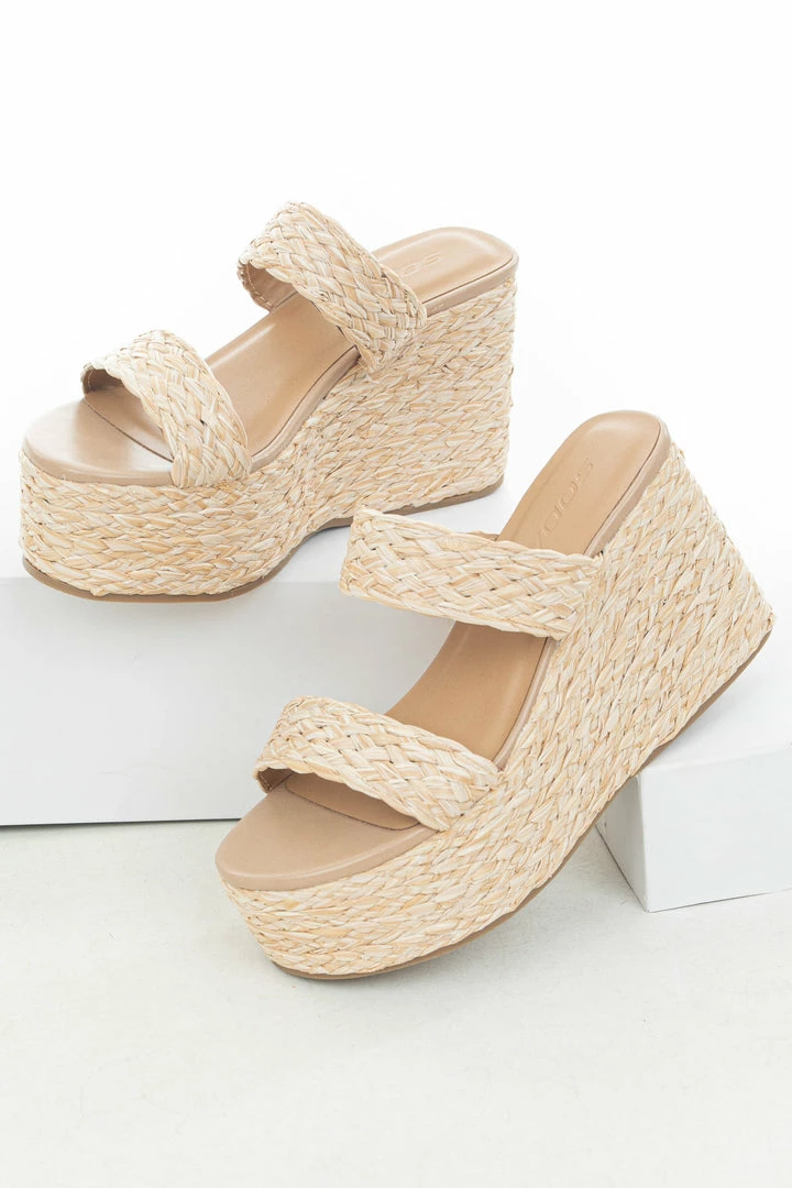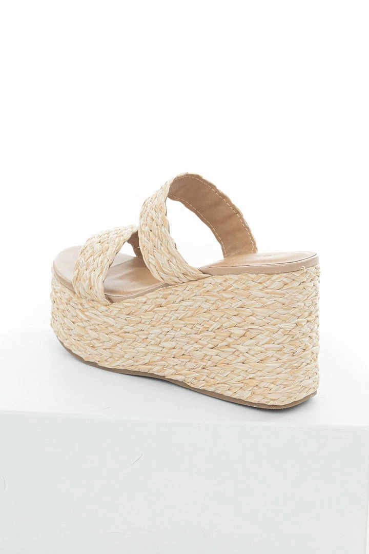 - Desert Sand Braided Straw Slip On Platform Wedges
