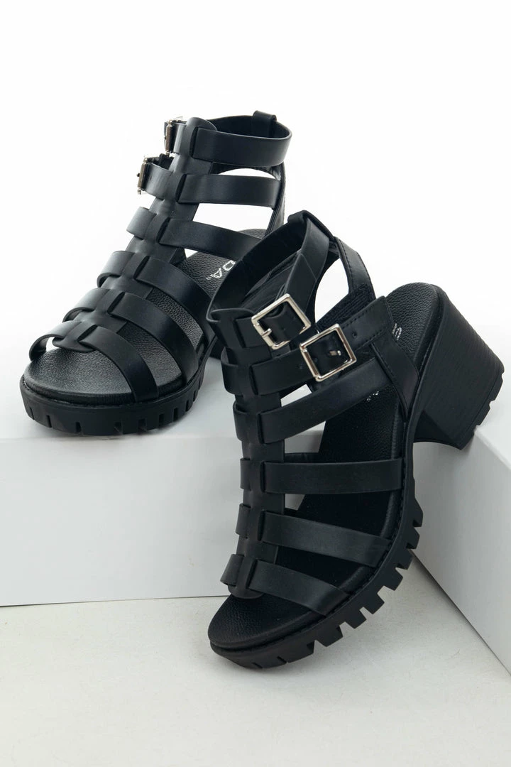 - Black Leather Strappy Treaded Heeled Sandals