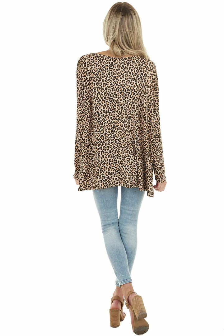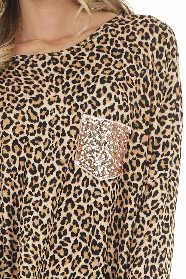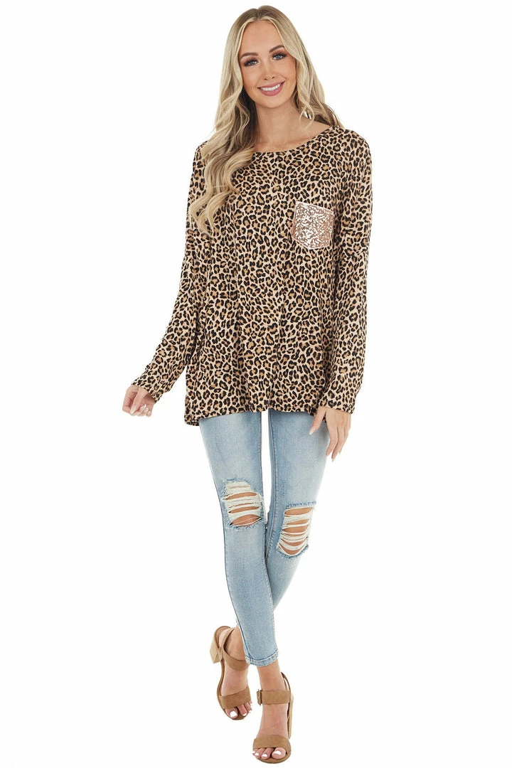 - Beige Leopard Print Long Sleeve Top with Sequin Chest Pocket
