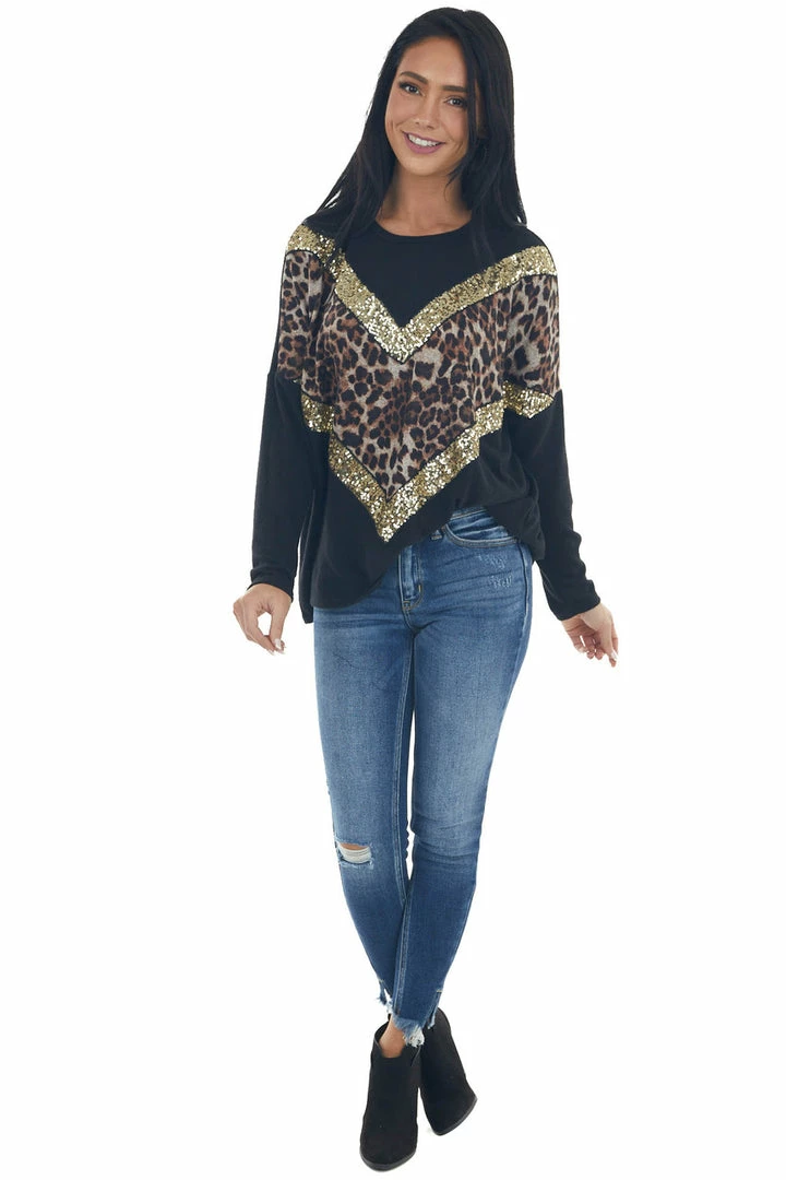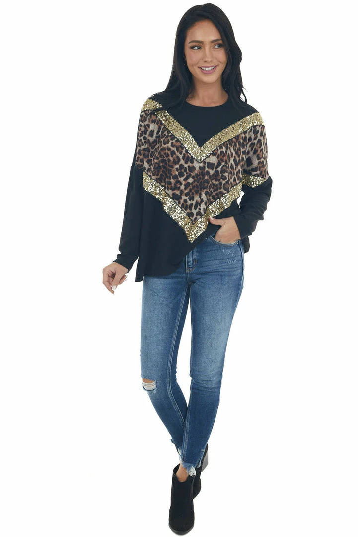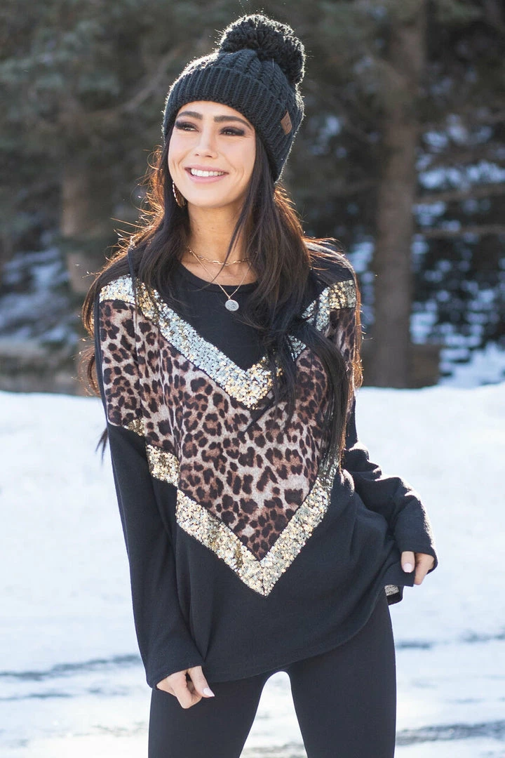- Black and Leopard Print Chevron Top With Gold Sequin Details