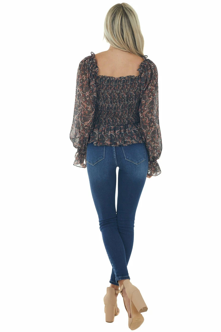 - Black Paisley Print Smocked Back Peplum Blouse