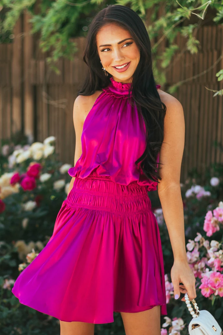 - Mulberry Halter Neck Smocked Satin Mini Dress