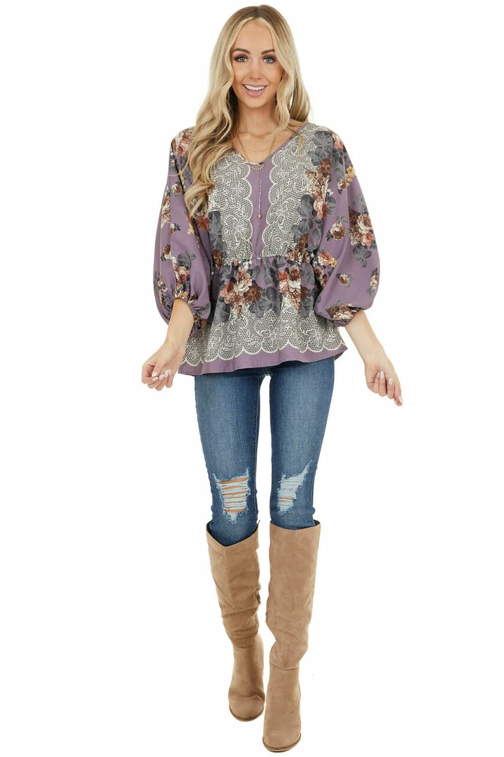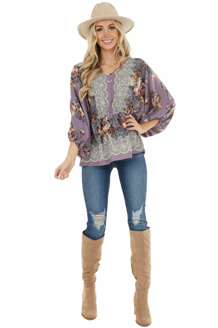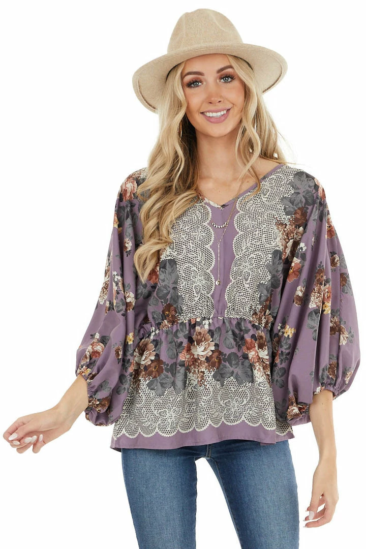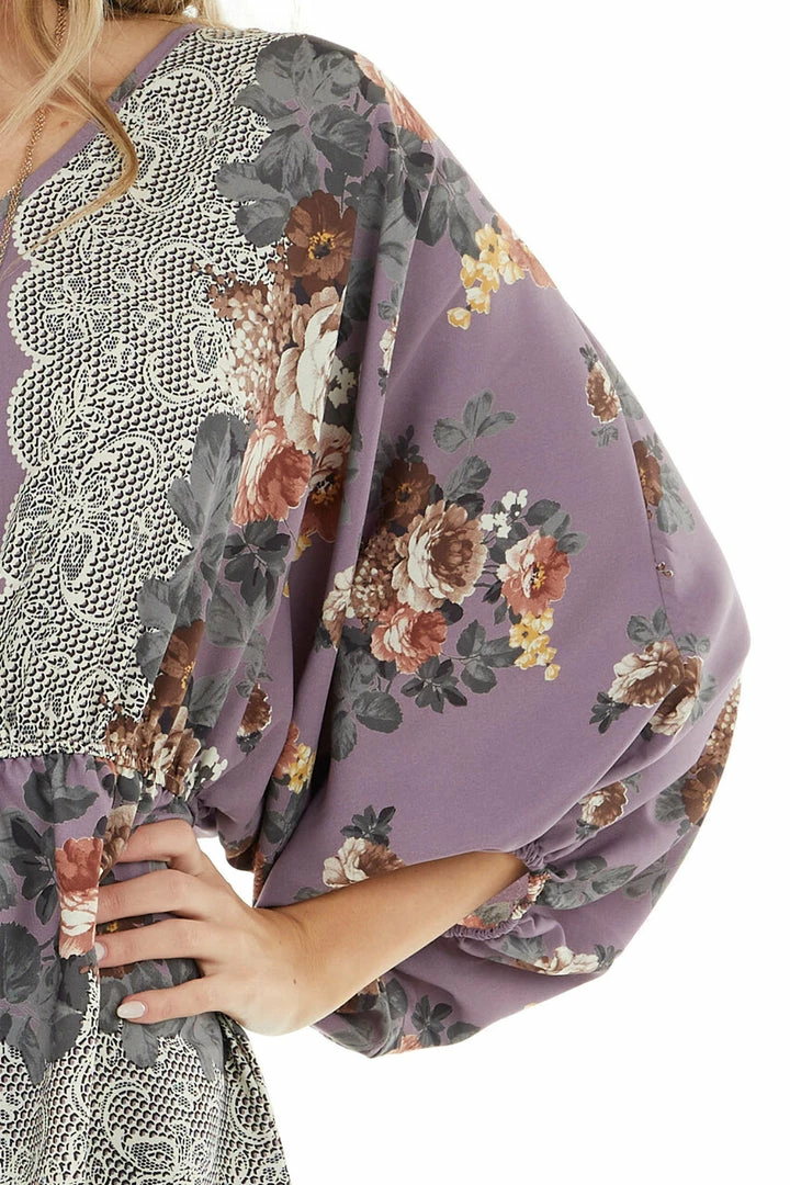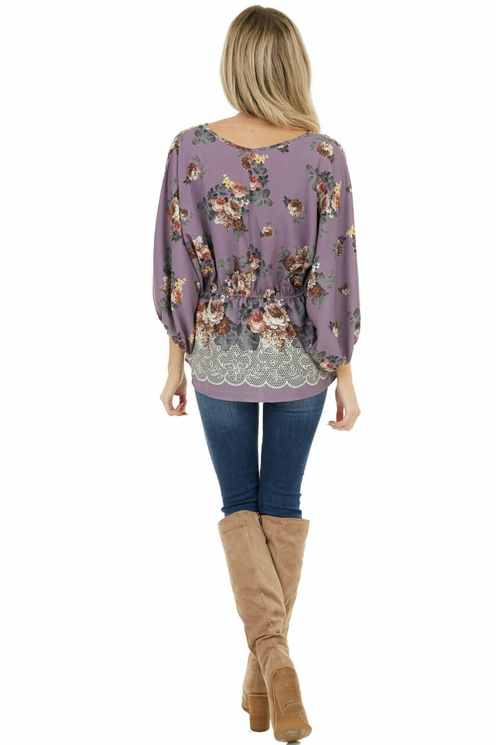 - Dark Lavender Floral Print Elastic Drop Waist Blouse