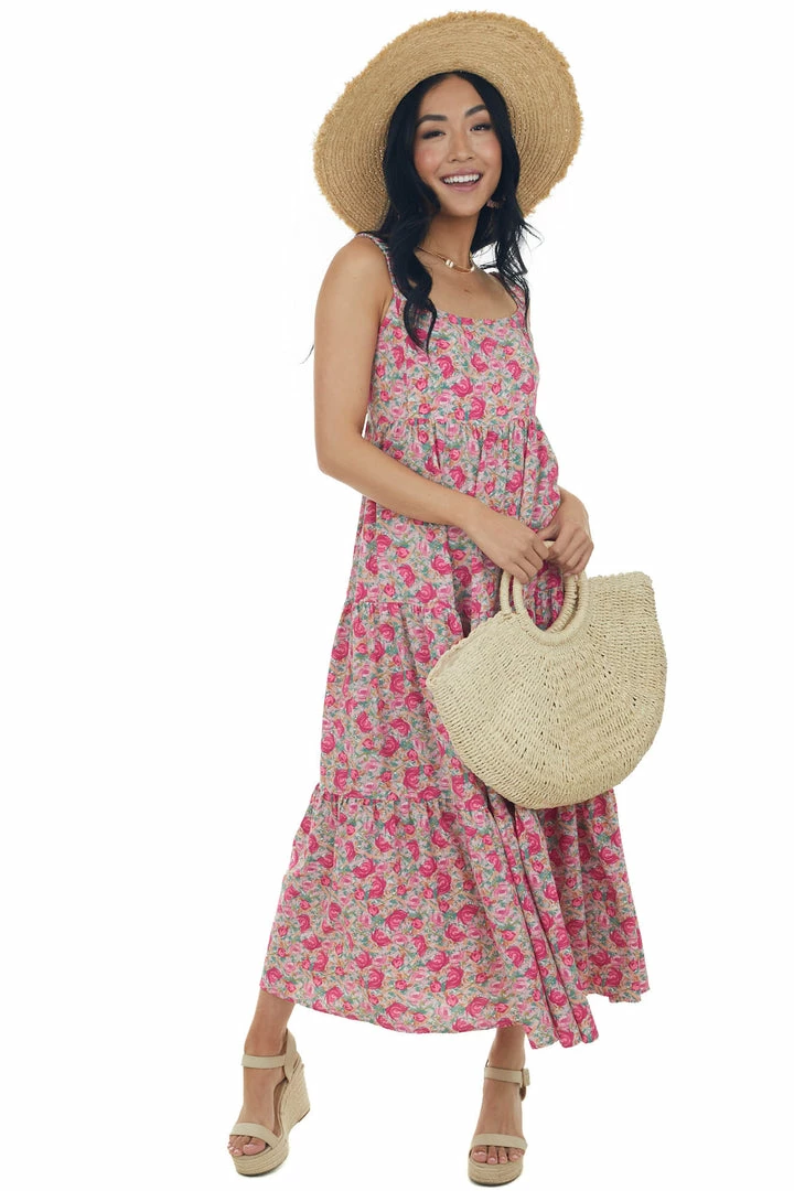 - Faded Magenta Floral Sleeveless Tiered Maxi Dress