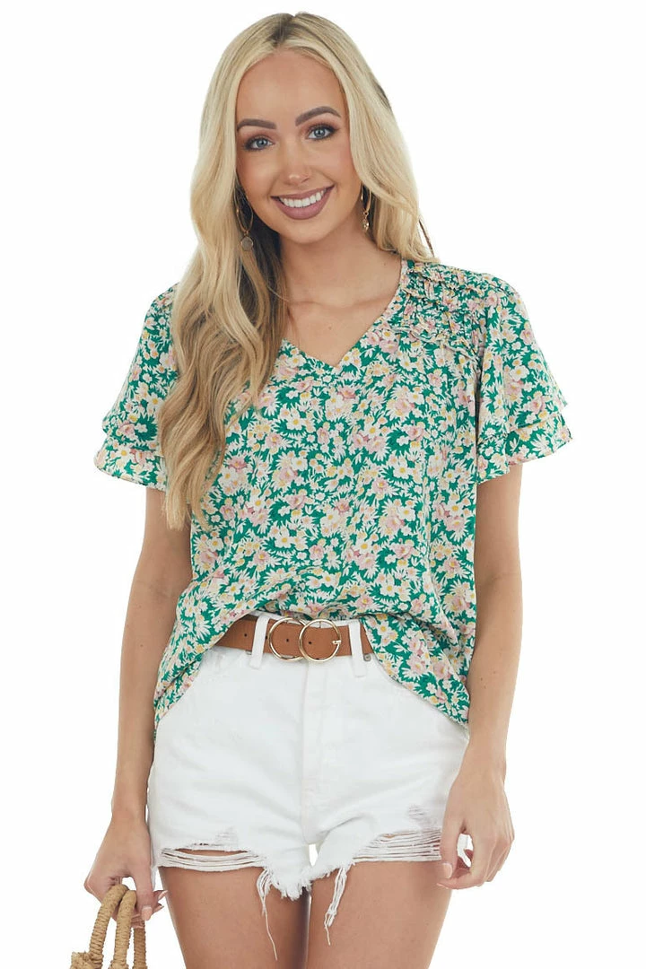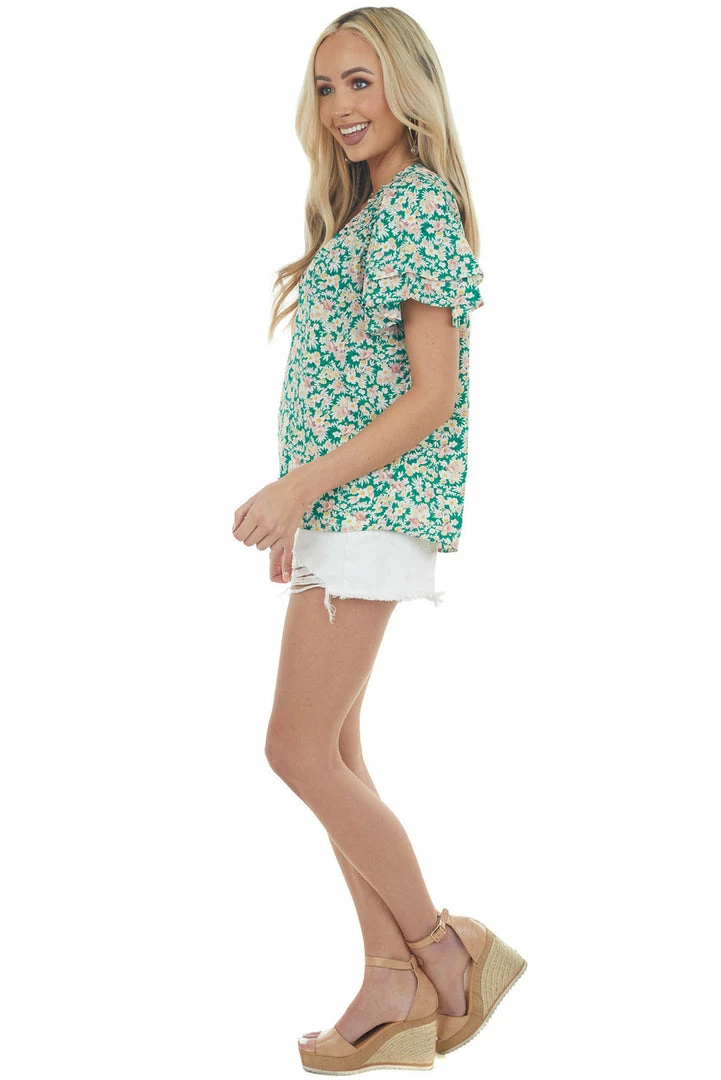 - Jade Floral Print V Neck Flutter Sleeve Blouse