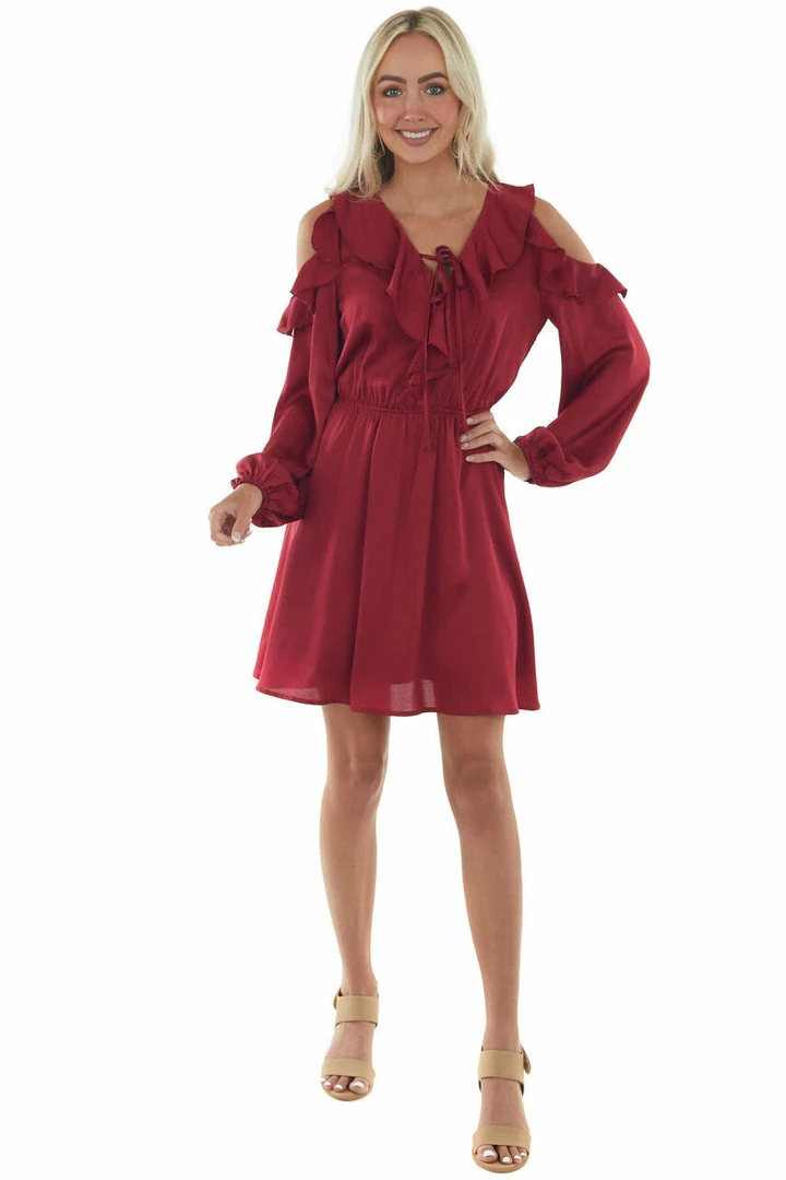 - Maroon Red Cold Shoulder V Neck Short Dress