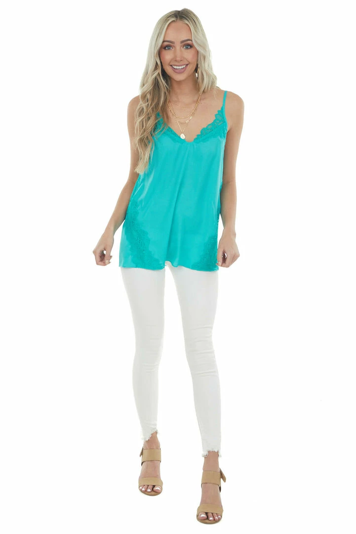- Teal V Neck Sleeveless Tank Top with Lace Details