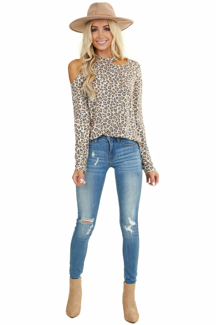 - Cognac Leopard Print Cold Shoulder Long Sleeve Knit Top