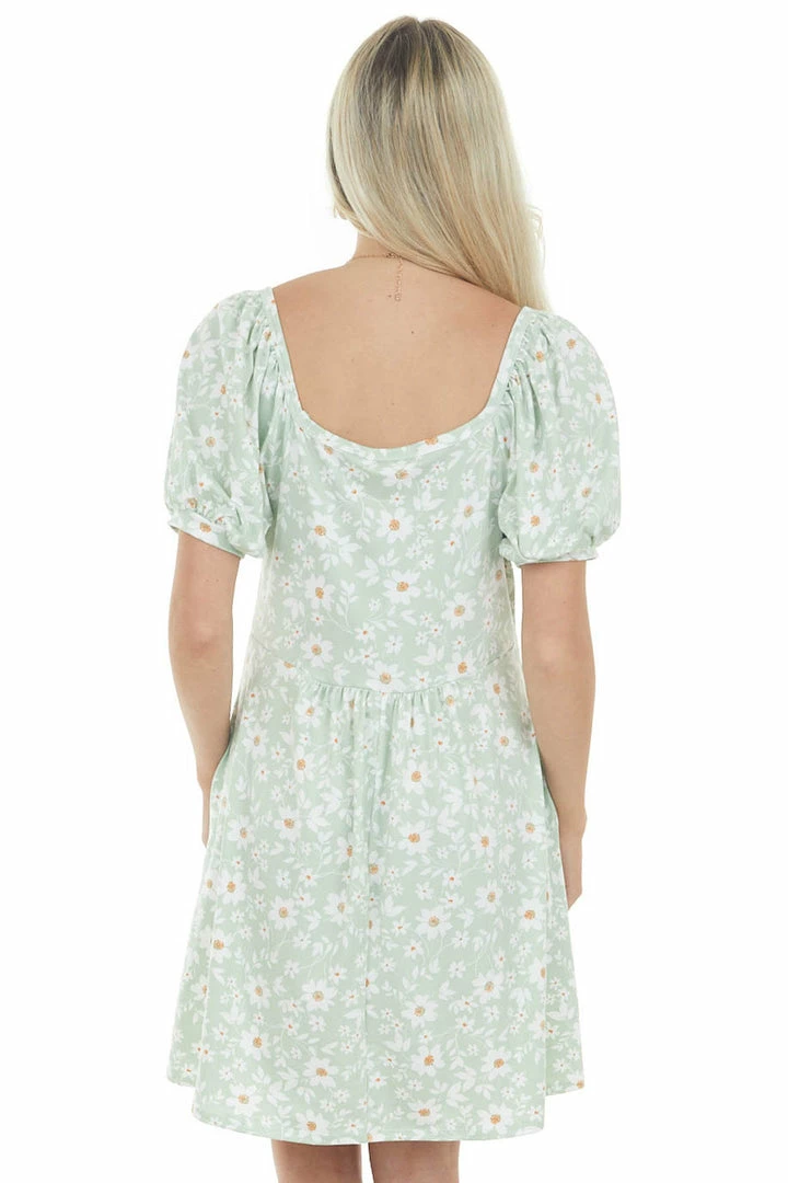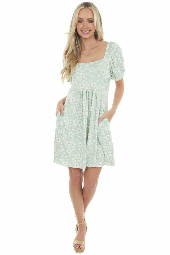 - Light Sage Floral Puff Sleeve Knit Short Dress