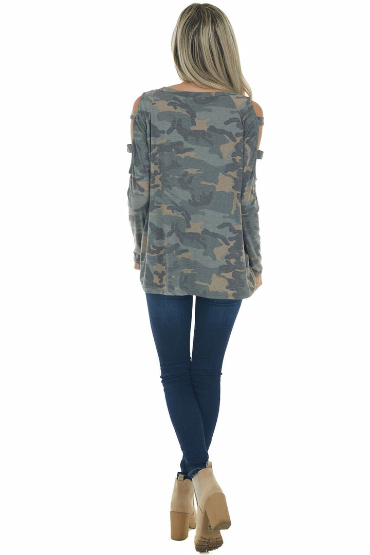 - Olive Camo Raglan Sleeve Ladder Cut Out Top