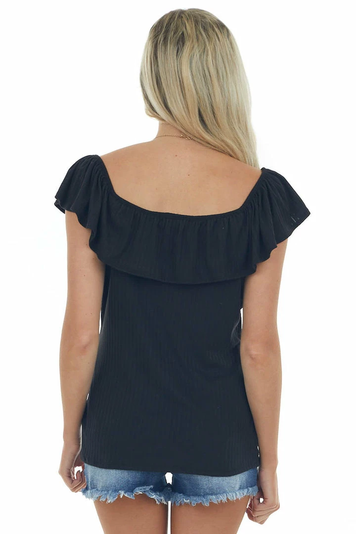 - Black Ribbed Knit Top with Ruffle Overlay