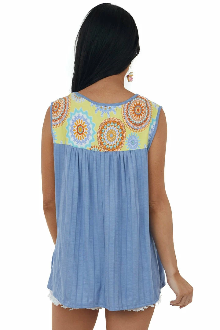 - Cornflower Ribbed Sleeveless Medallion Print Top