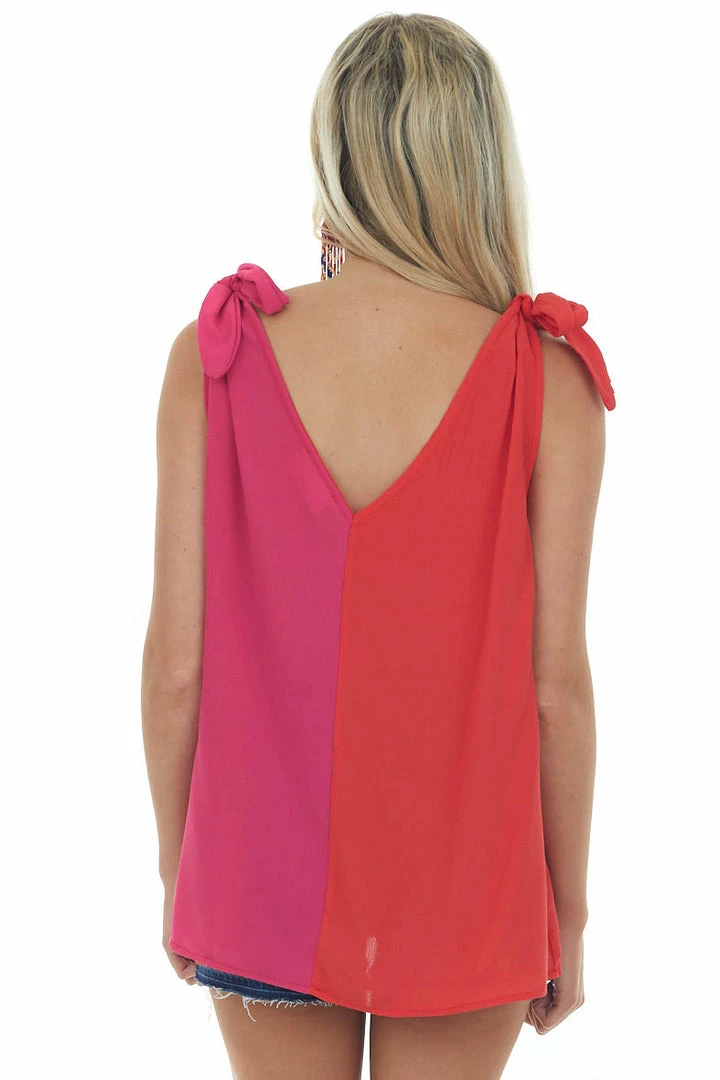 - Lipstick Colorblock V Neck Tie Strap Blouse