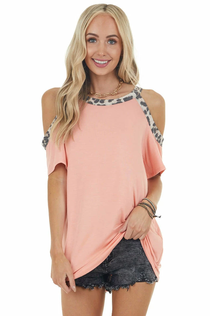 - Light Coral Leopard Print Contrast Cold Shoulder Knit Top