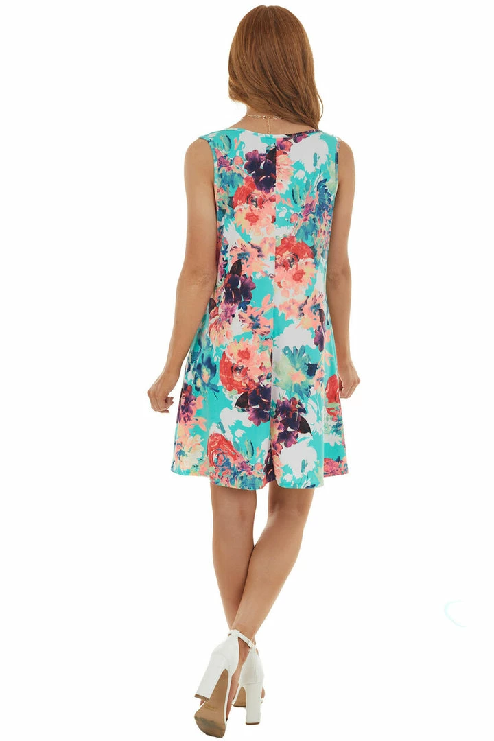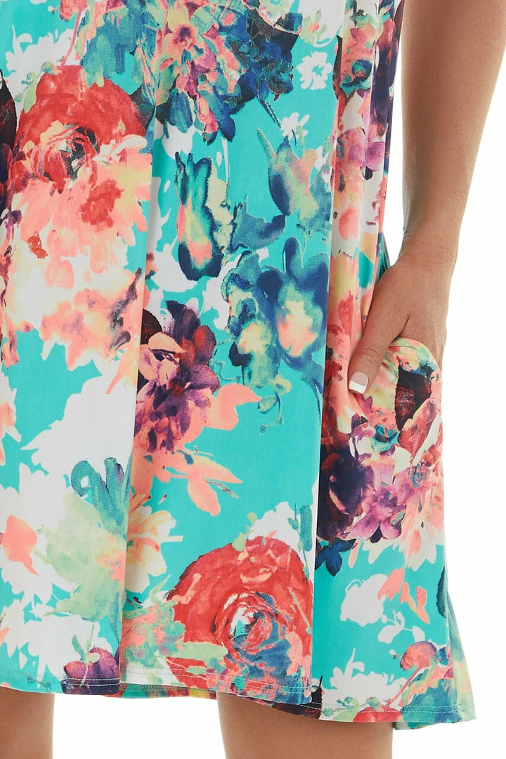 - Seafoam Neon Floral Sleeveless Swing Dress