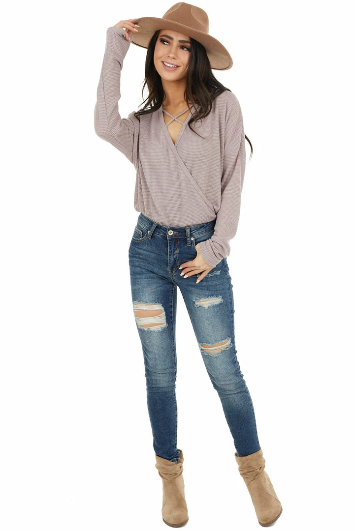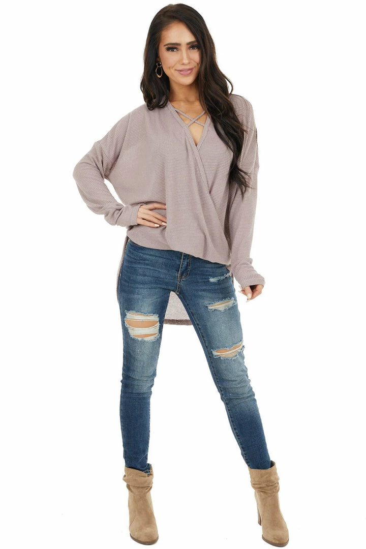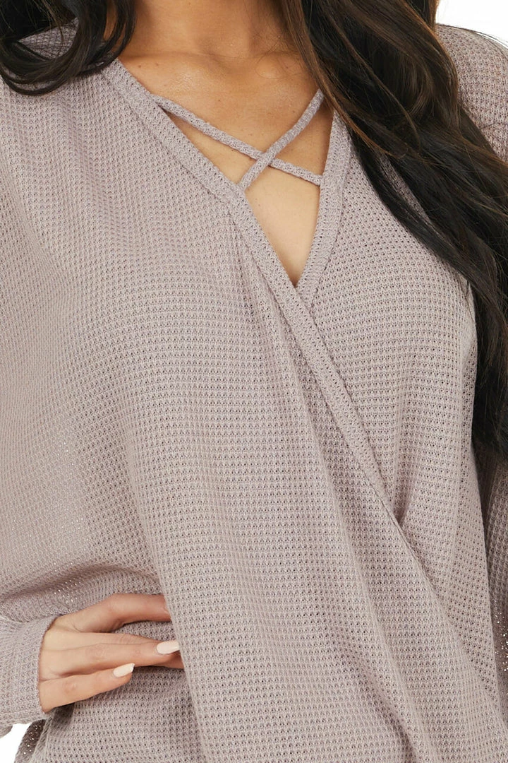 - Dusty Rose Waffle Knit Surplice Top with Criss Cross Detail