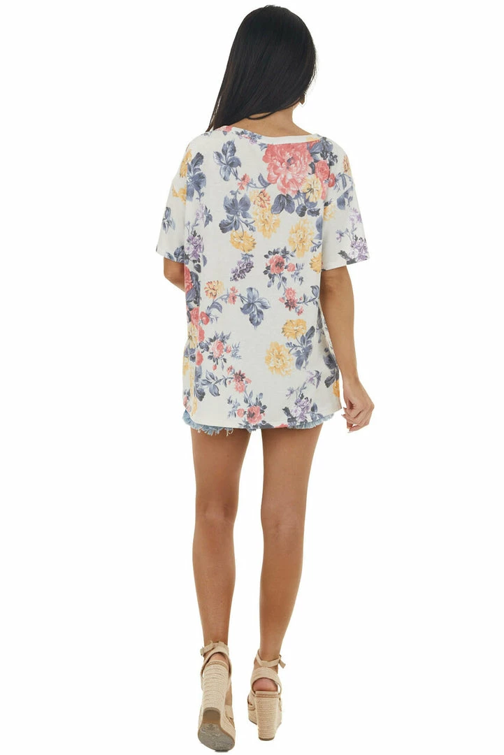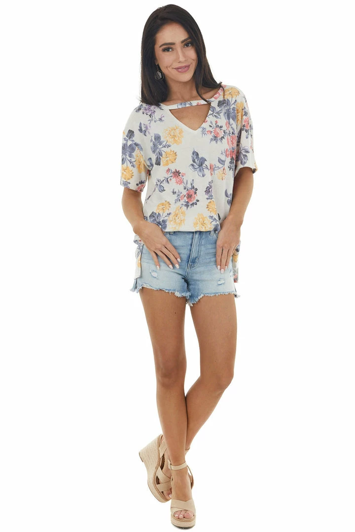 - Eggshell Floral Print Short Sleeve Top with Cut Out Detail