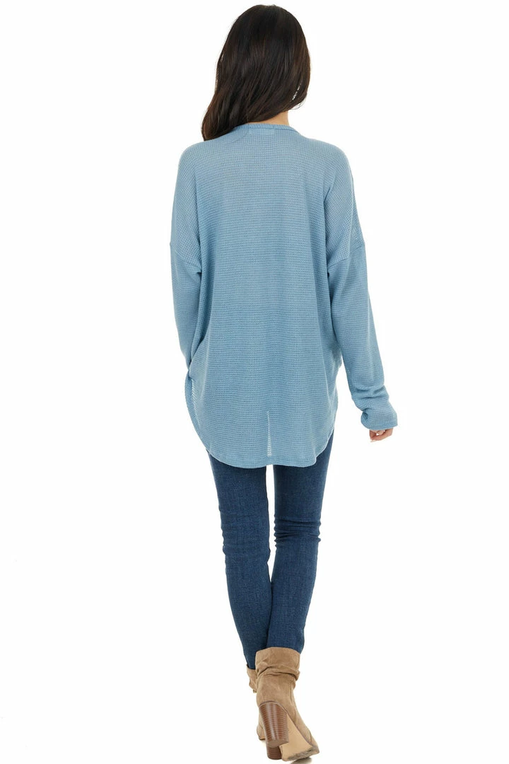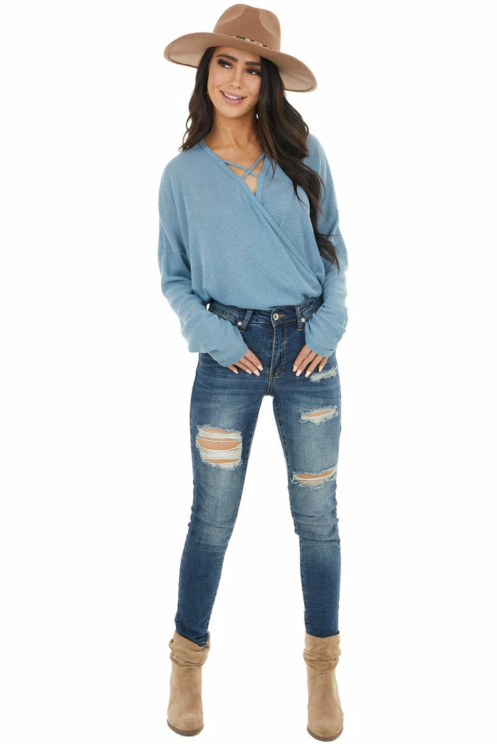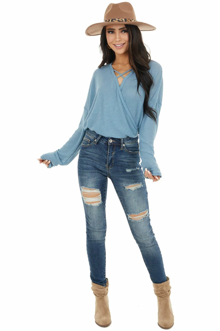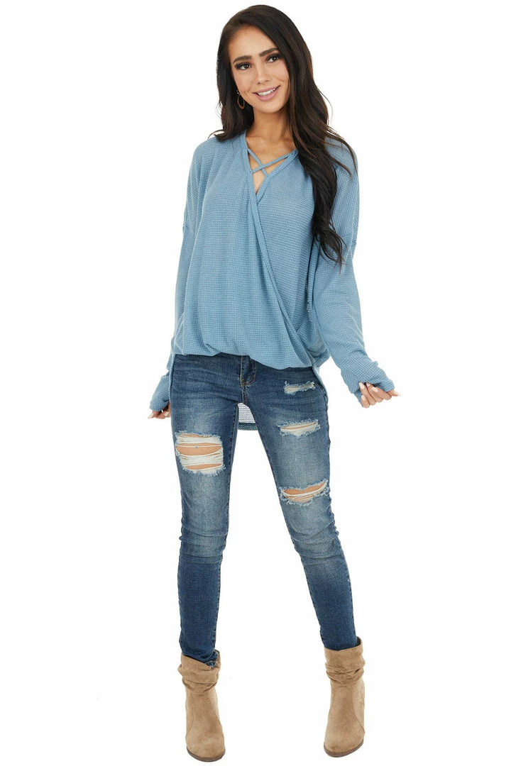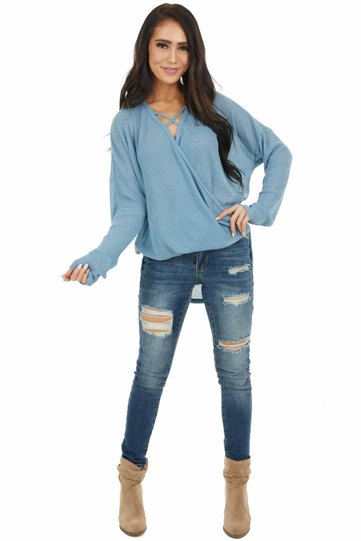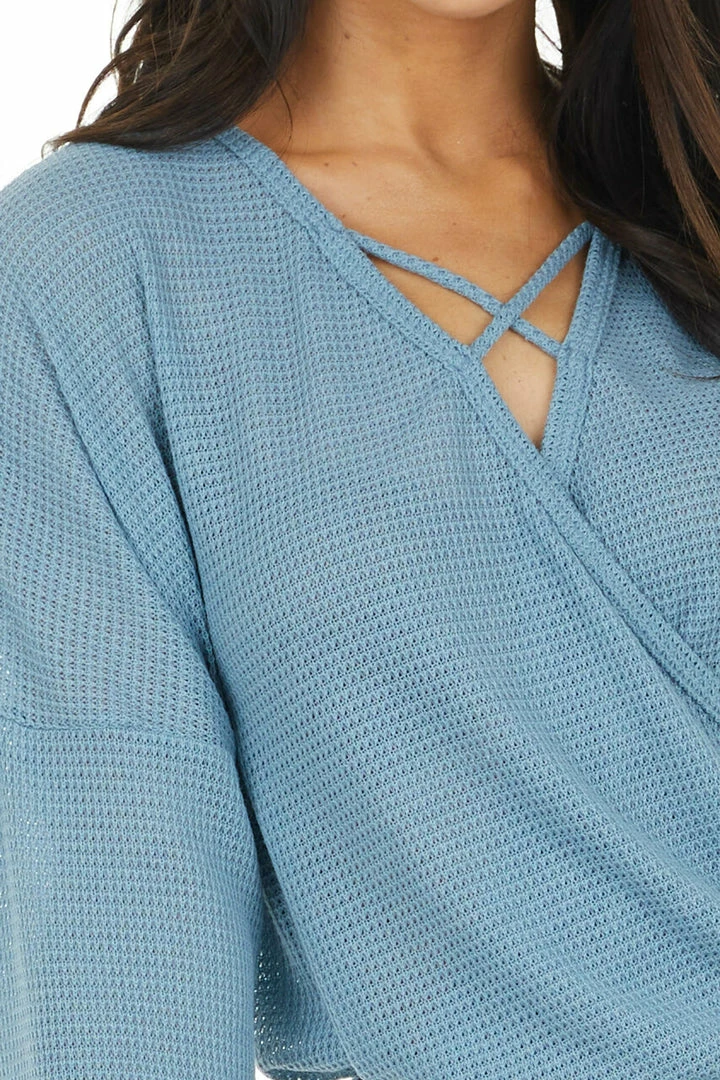 - Powder Blue Waffle Knit Surplice Top with Criss Cross Detail