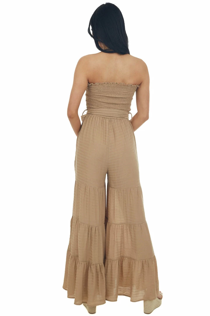 - Camel Strapless Smocked Flare Leg Jumpsuit