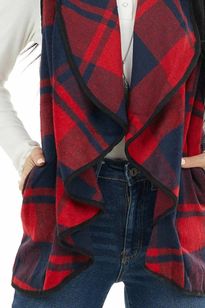 - Cherry and Navy Open Front Plaid Print Vest with Lapel