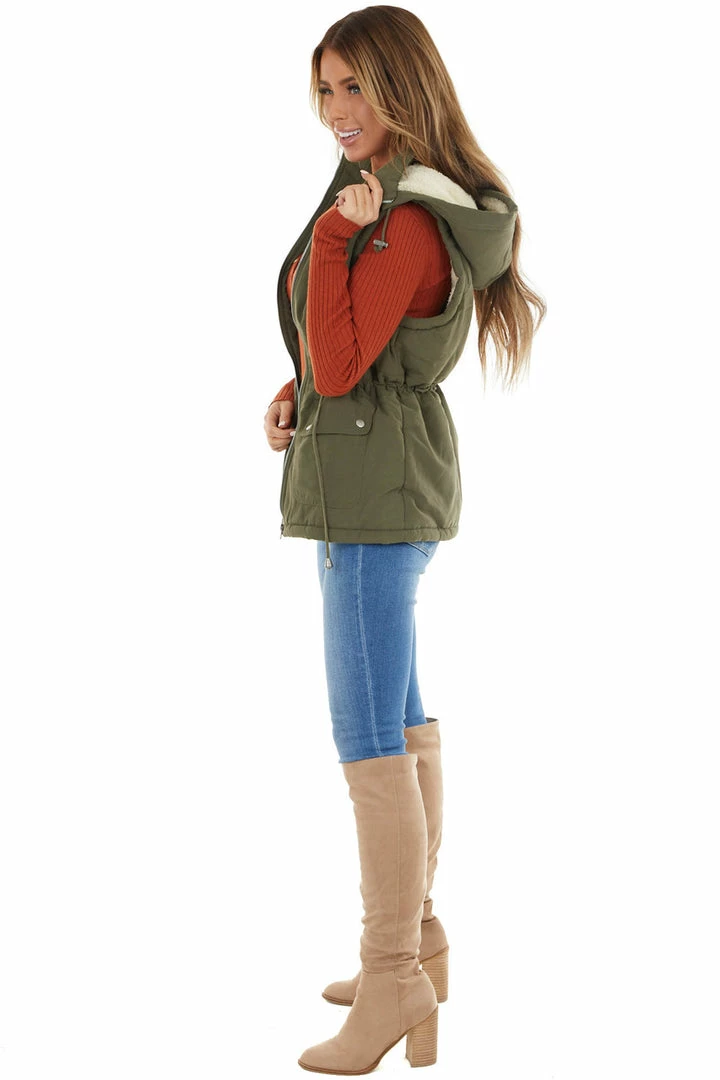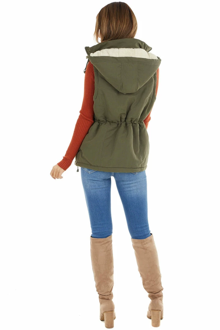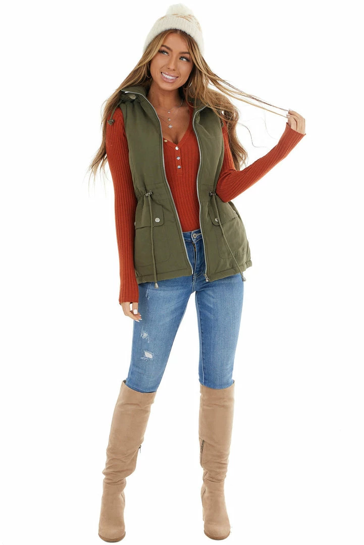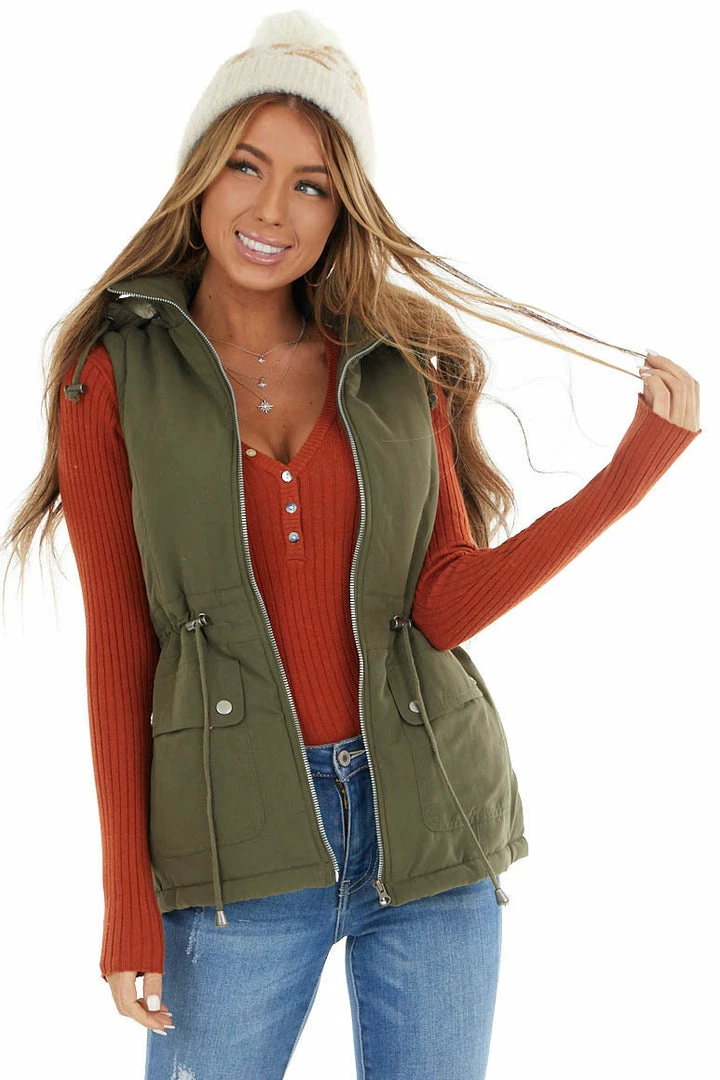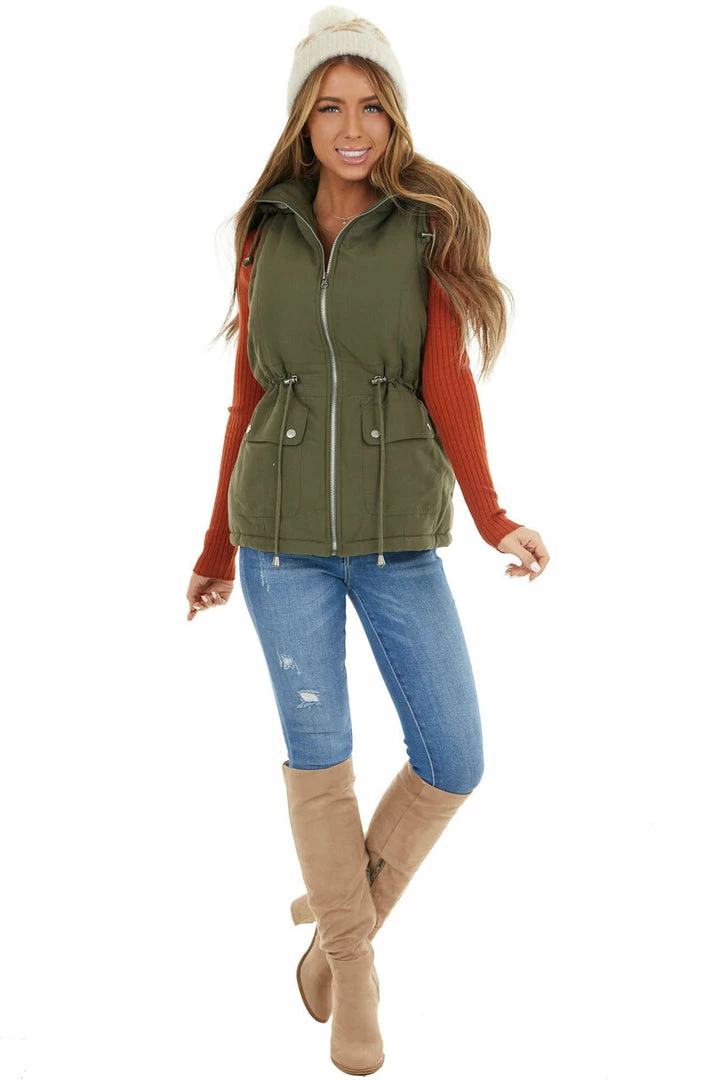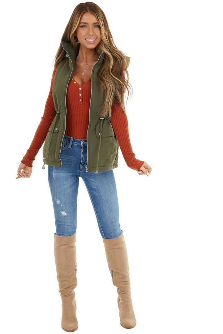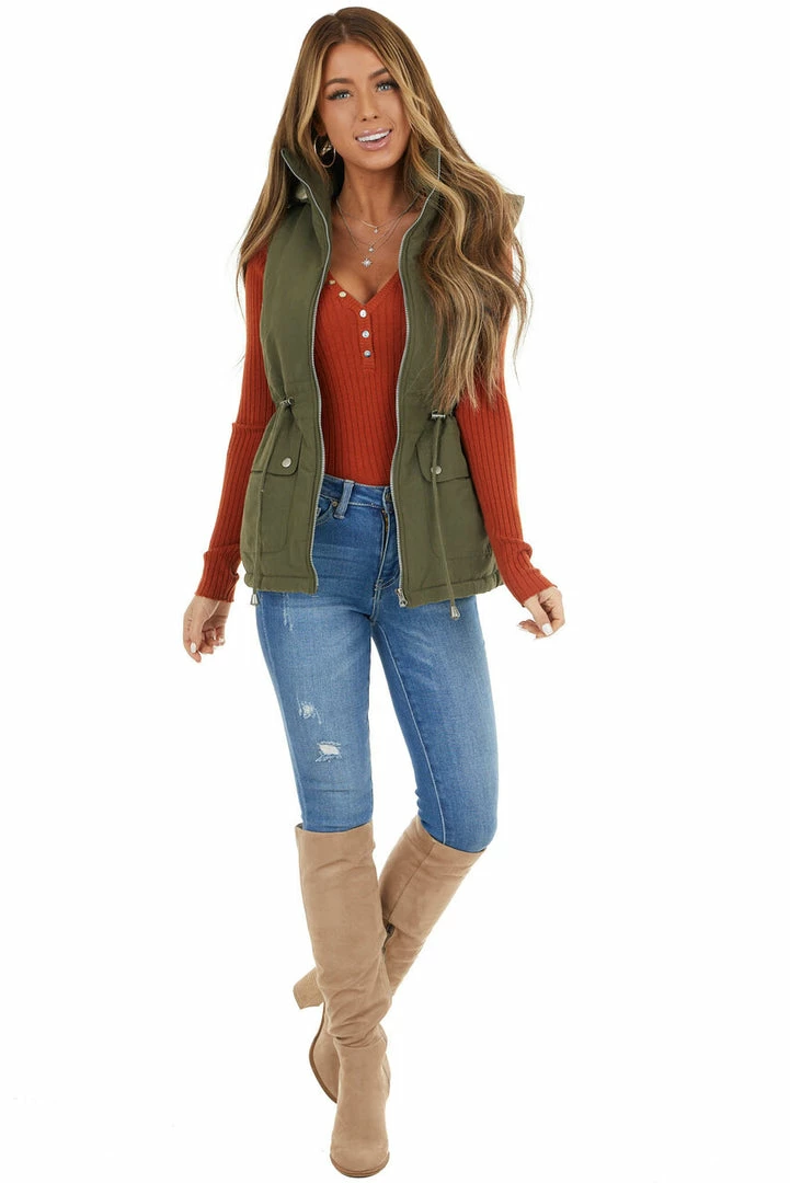 - Olive Green Sleeveless Zip up Vest with Mock Neckline