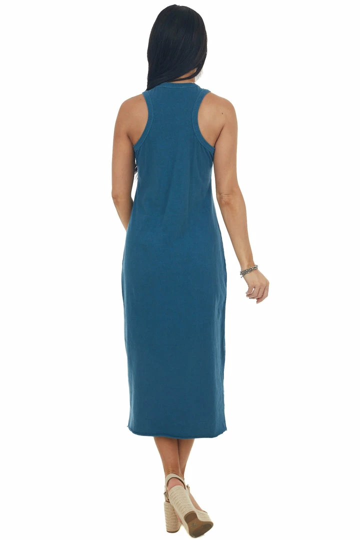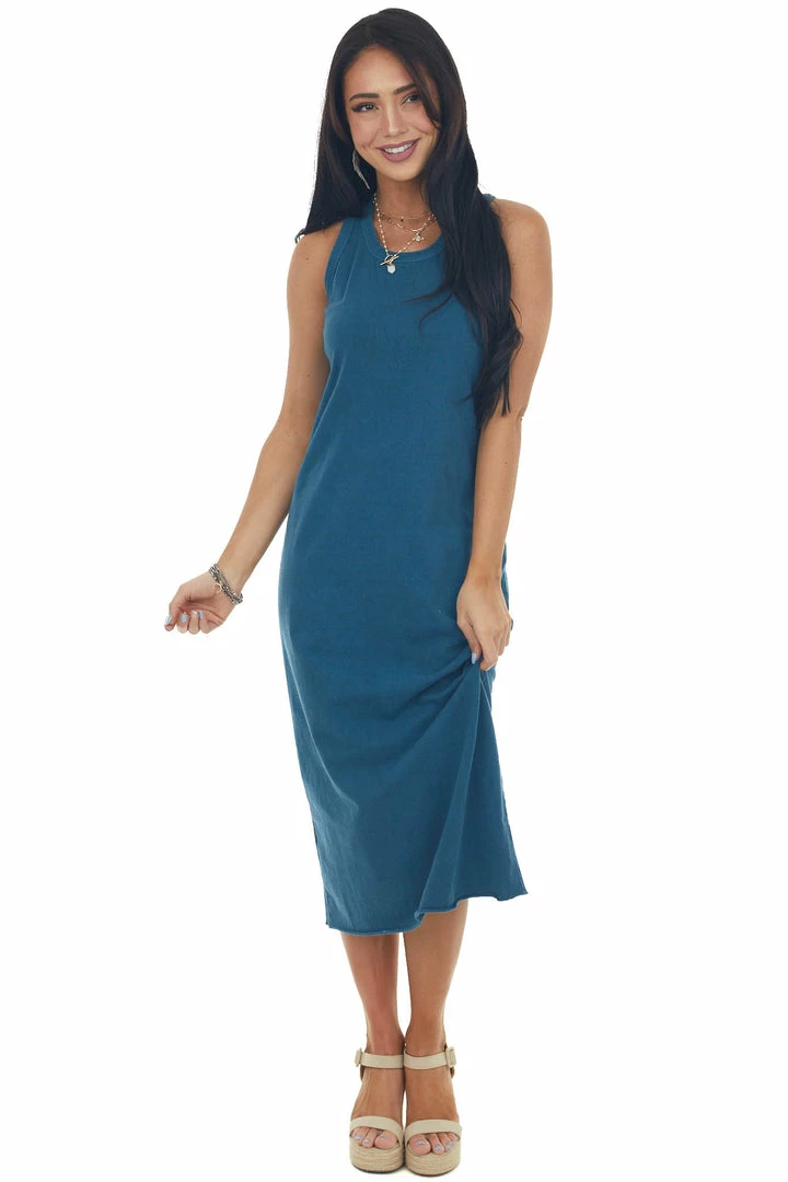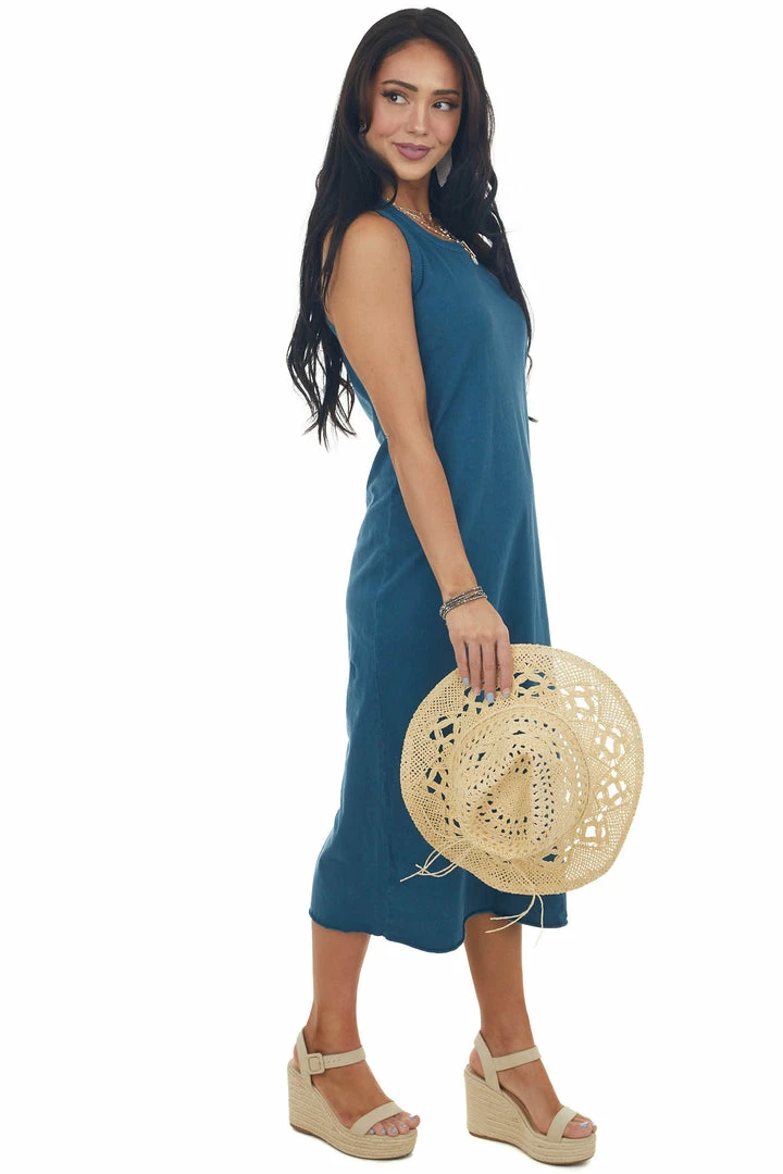 - Sea Blue Ribbed Trim Sleeveless Knit Midi Dress
