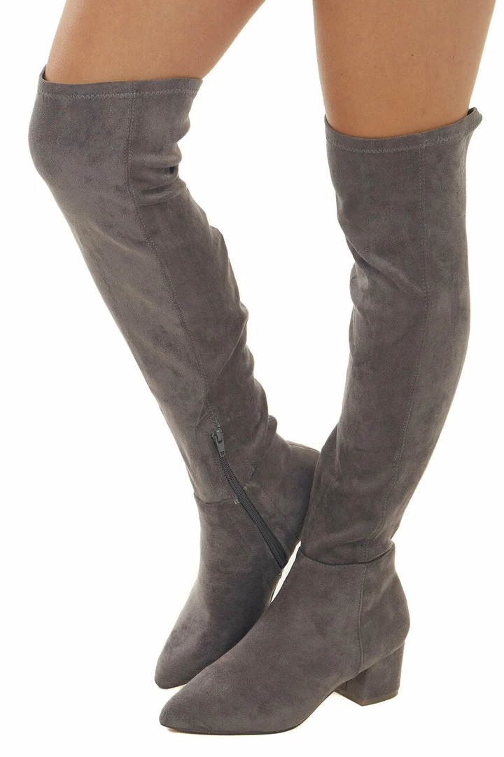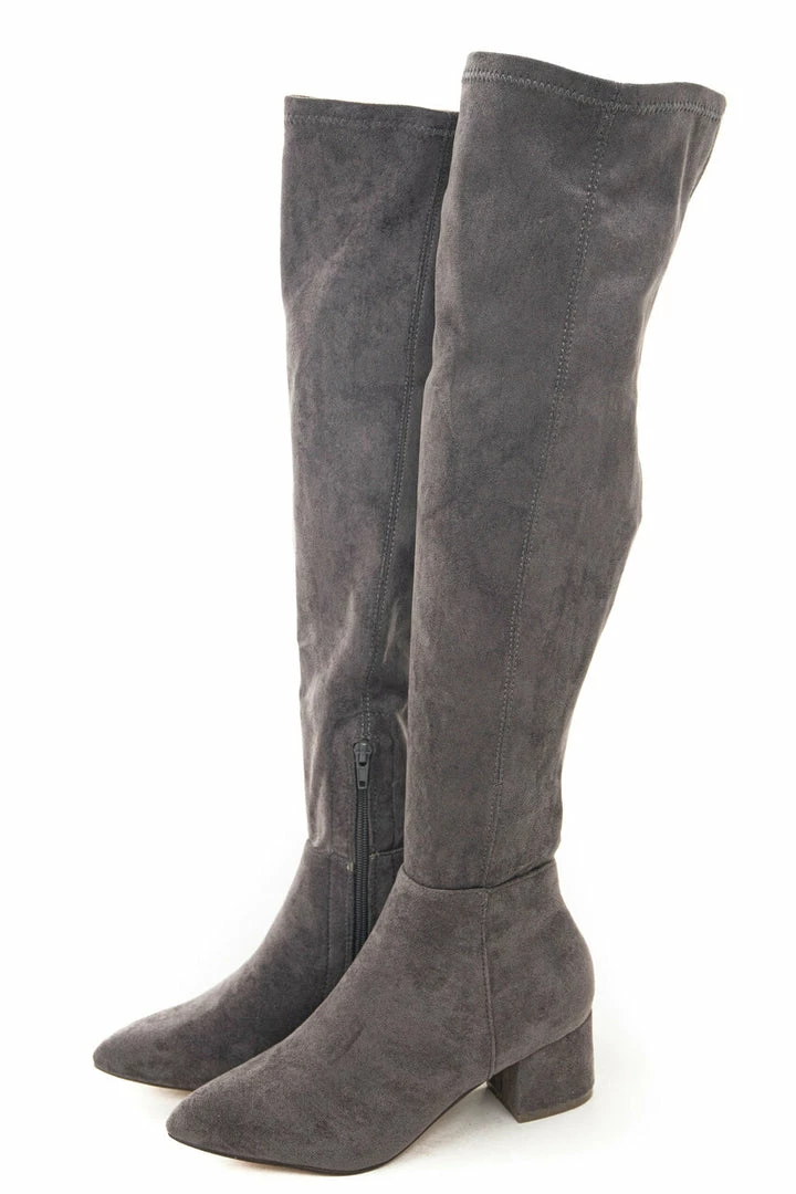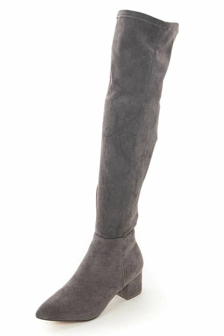 - Stone Faux Suede Knee High Chunky Heel Boots