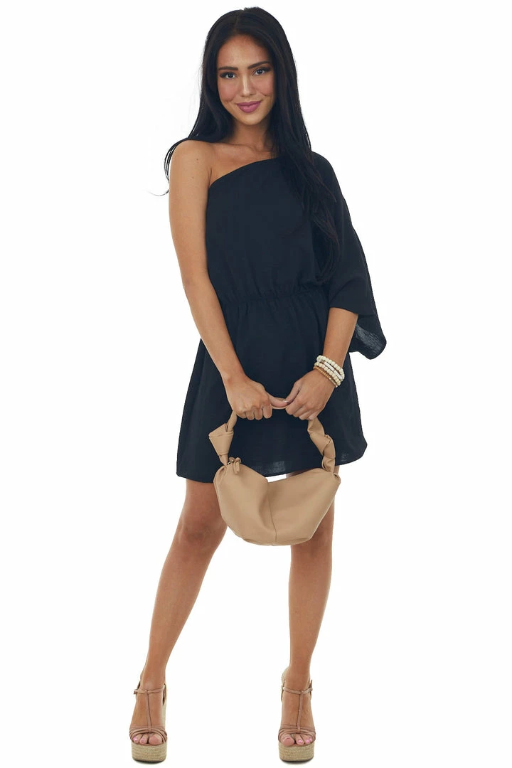 - Black One Shoulder Cinch Waist Mini Dress