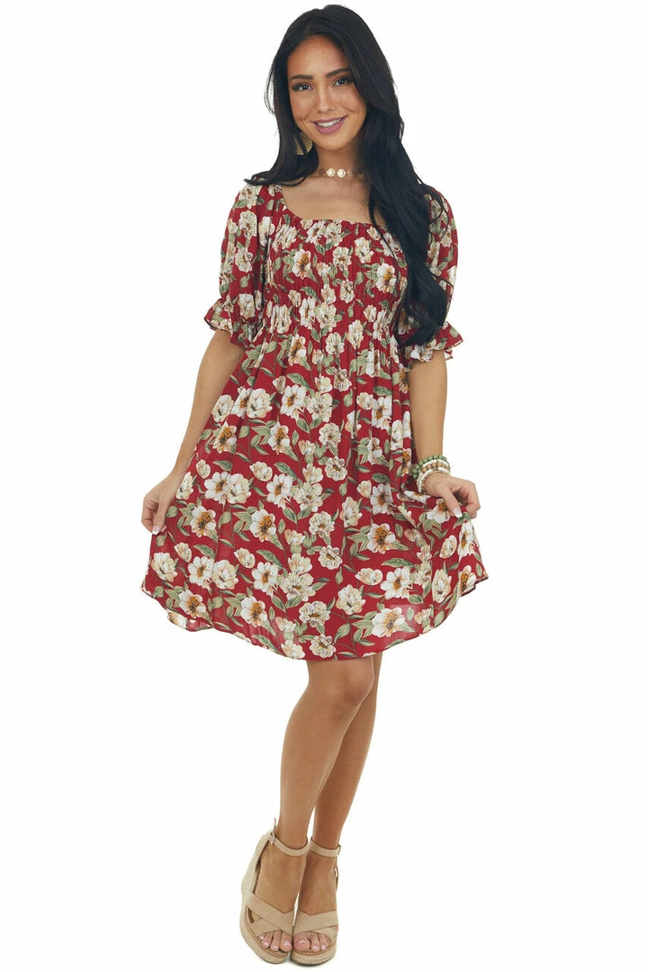 - Cranberry Red Floral Print Smocked Short Dress