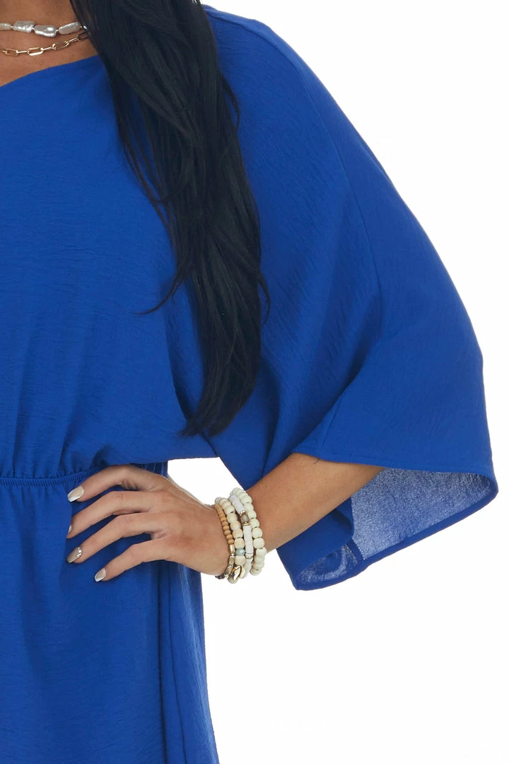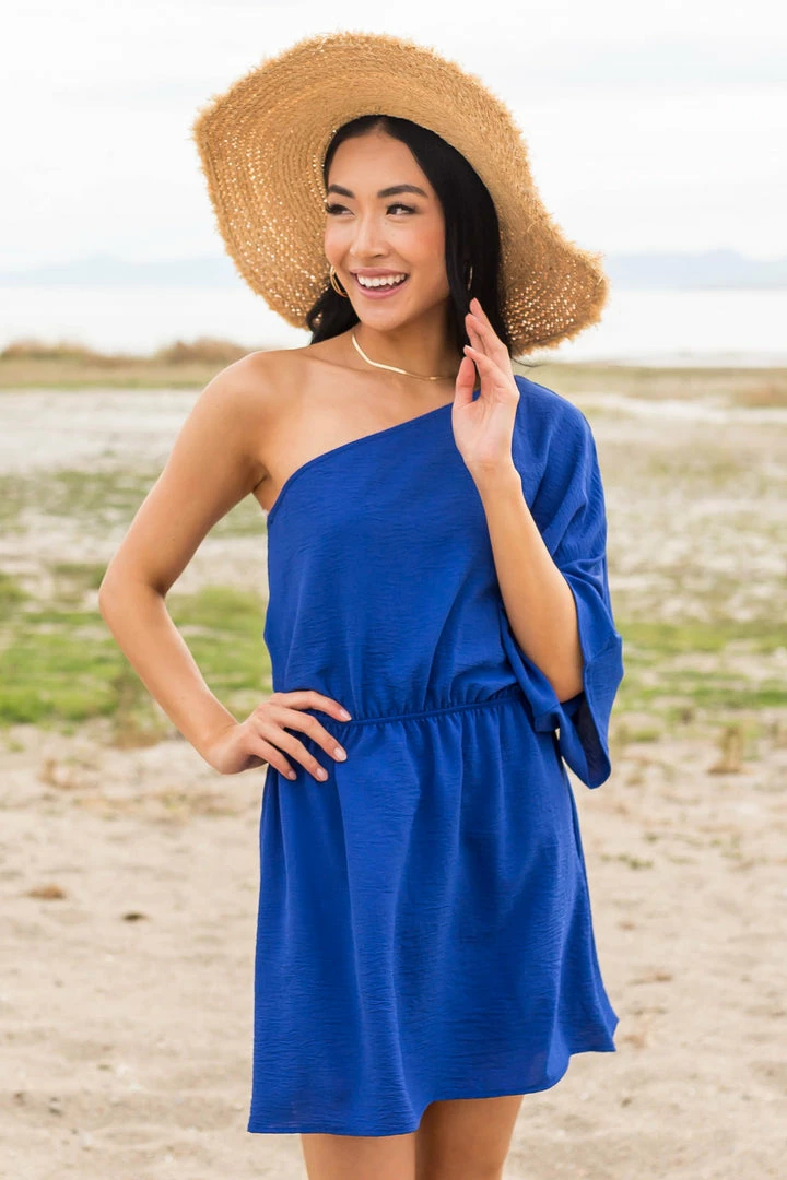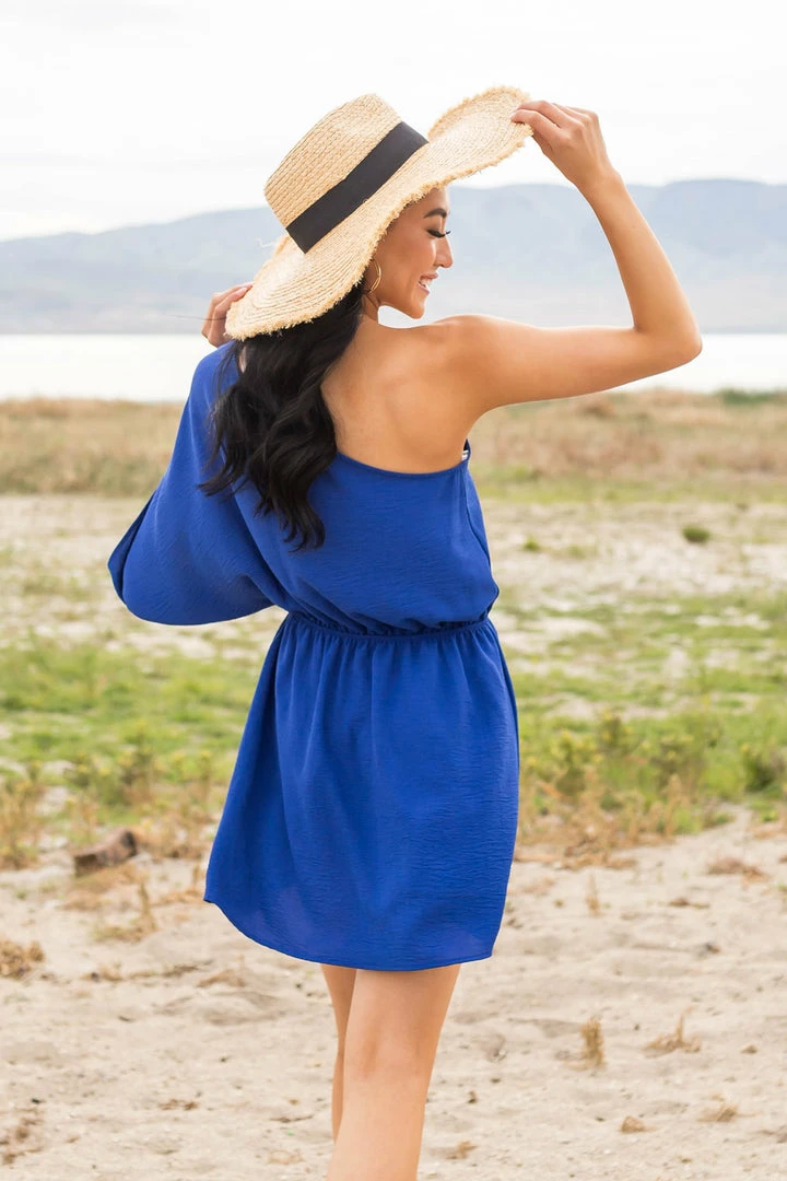 - Royal Blue One Shoulder Cinch Waist Mini Dress