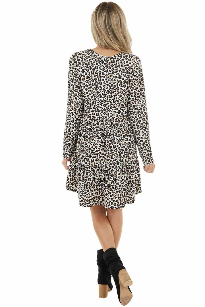 - Ivory and Camel Leopard Print Babydoll Dress with Ruffle Hem