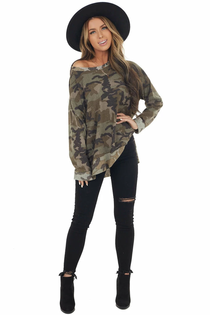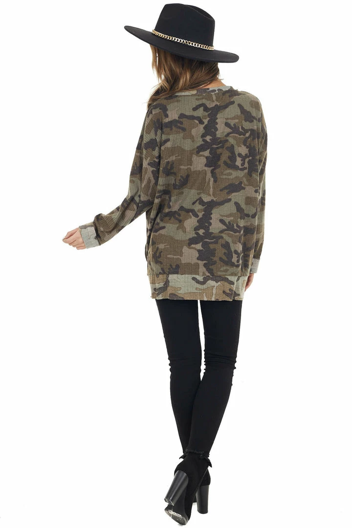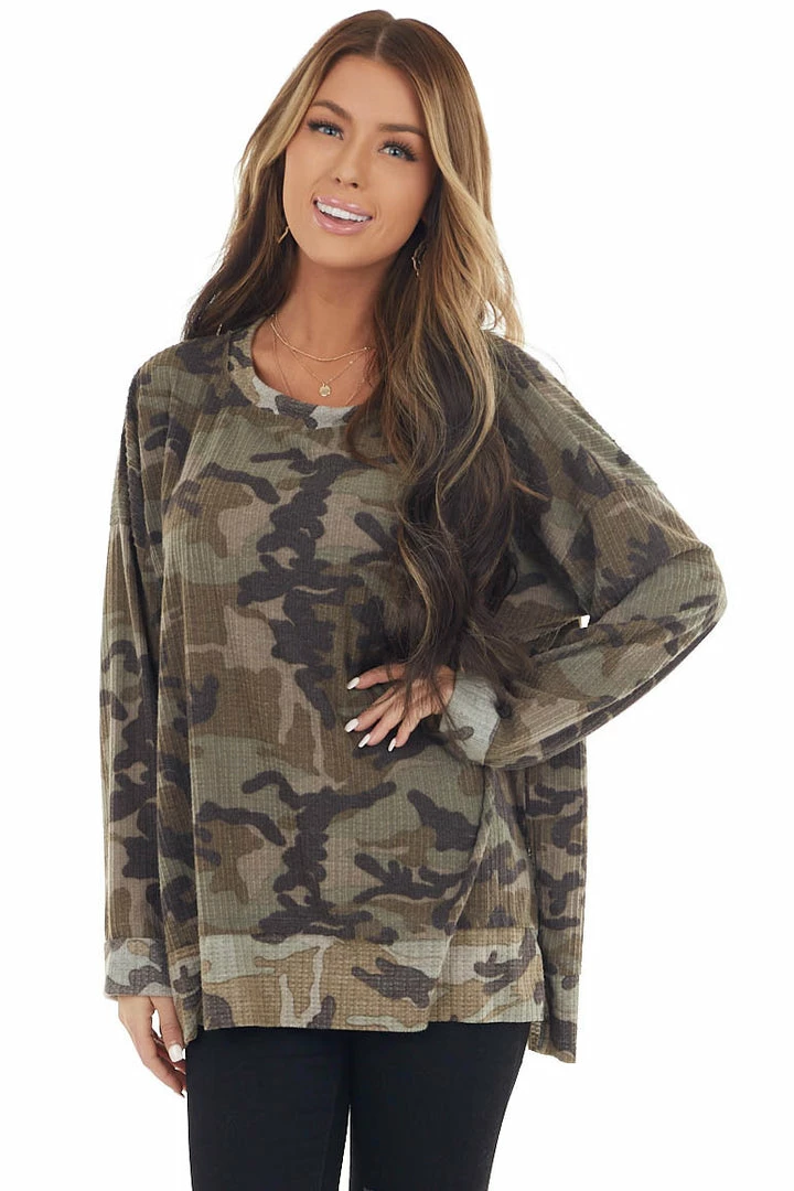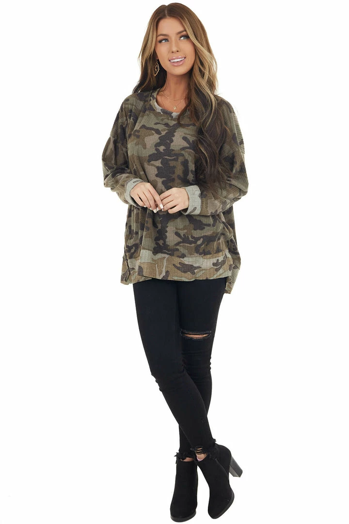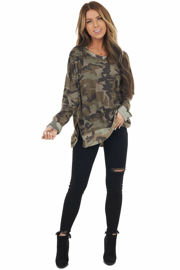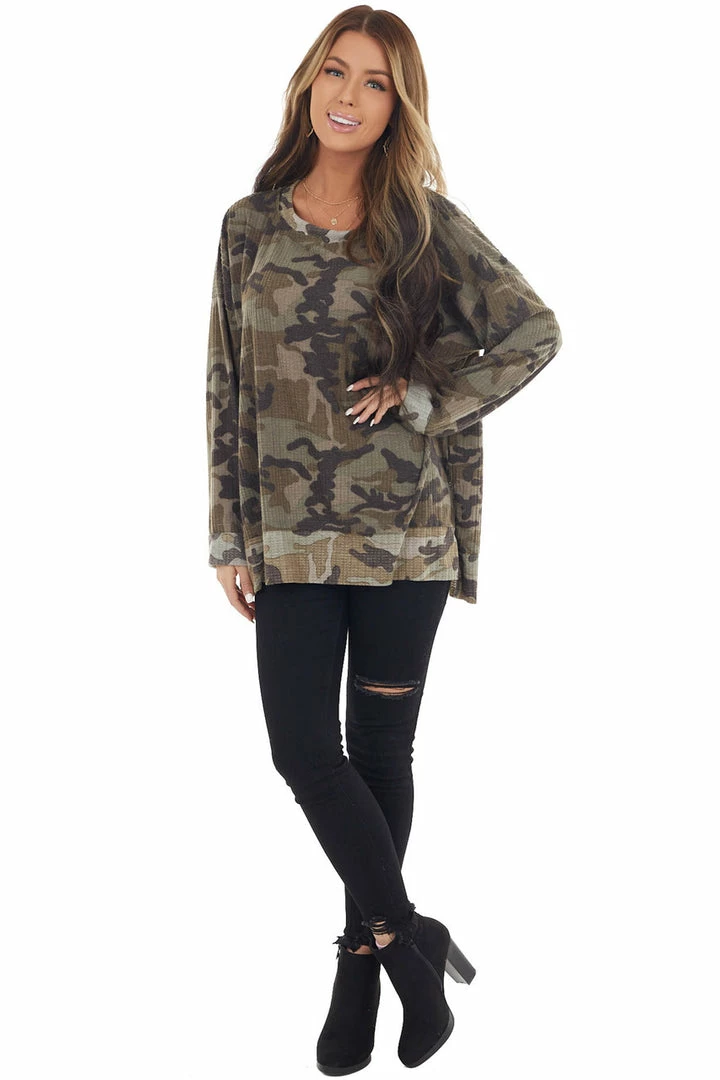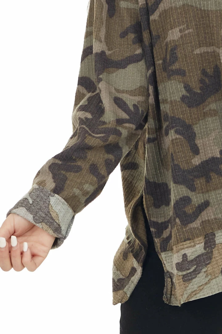 - Olive Camo Waffle Knit Long Sleeve Top with Side Slits