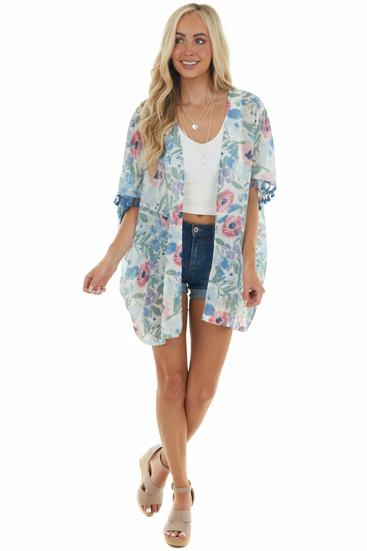 - Dusty Blue Floral Chiffon Open Front Kimono