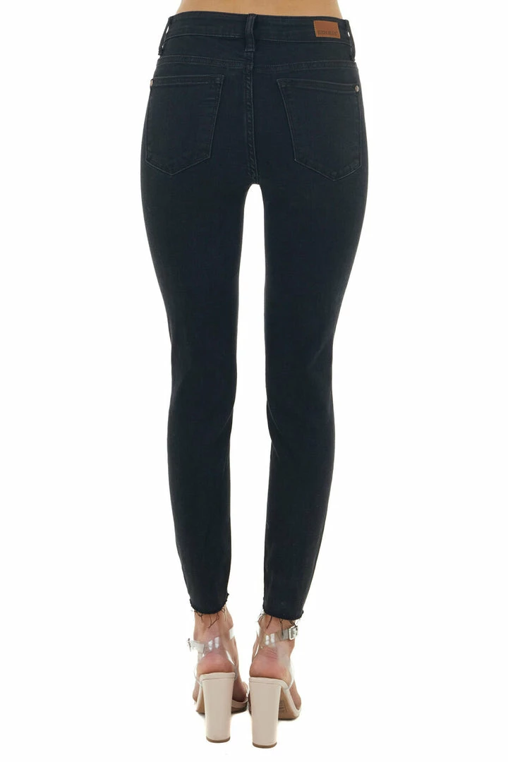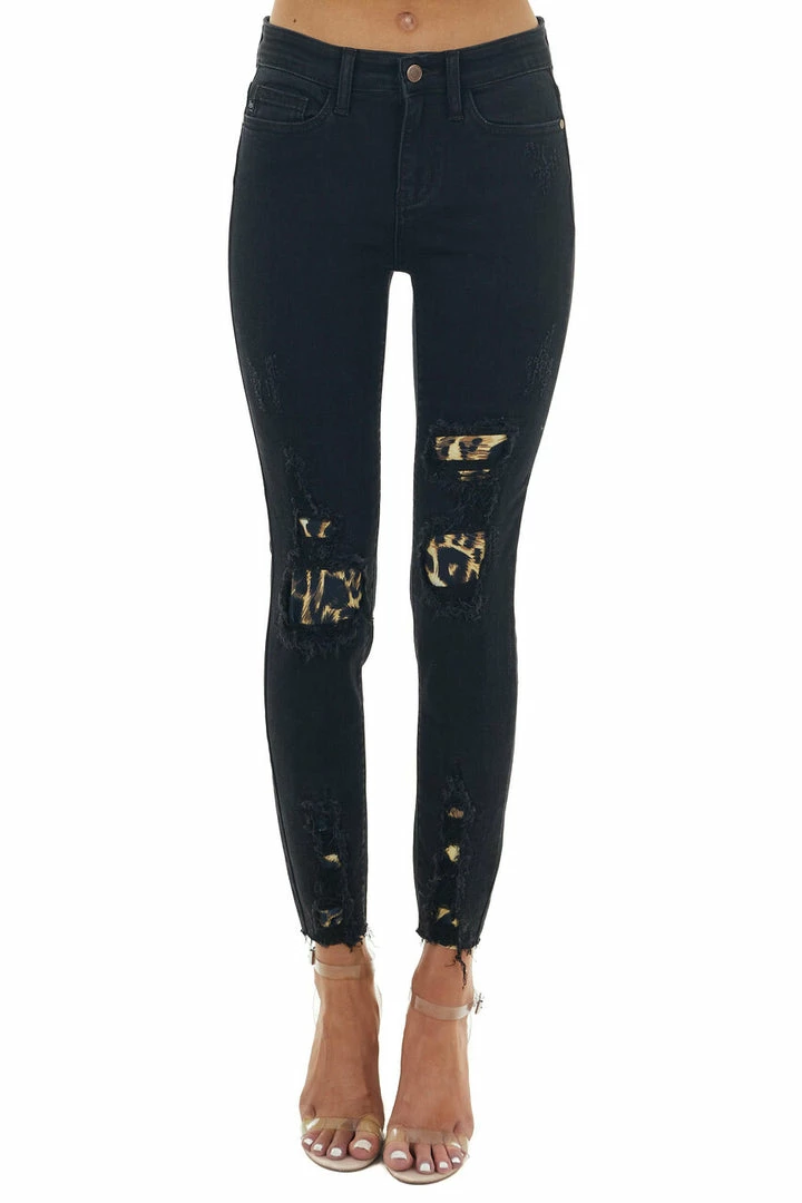 - Black Mid Rise Distressed Skinny Jeans with Leopard Patches